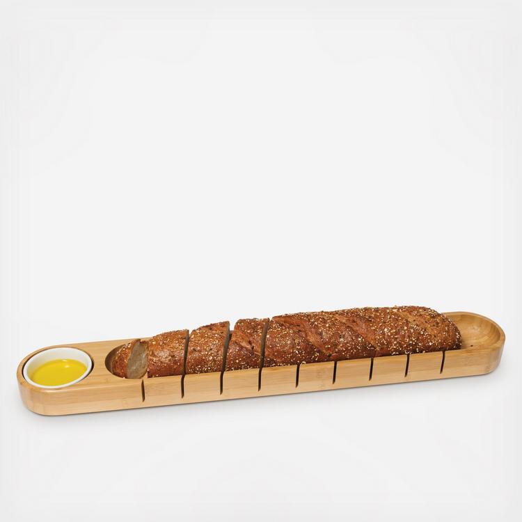 Slice baguettes perfectly every time with our Bamboo French Bread Board with Ceramic Dip Bowl. This helpful tool doubles as a serving board for the cut bread, with the unique feature of a ceramic dip bowl to elevate your presentation. Eco-friendly bamboo lets you serve your guests sustainably and in style! The narrow profile is perfect for even the most crowded of family tables.