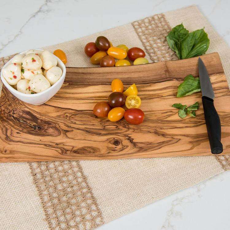 This beautiful wooden cutting board is crafted from durable and attractive olive wood. The density of olive wood makes it less susceptible to stains, odors, and even knife gashes. Each piece crafted of this extremely hard and durable wood is shaped and sanded, then polished with food-safe oil to moisturize the surface and bring out the beautiful color and grain pattern. In your kitchen, dining room, or living room, these boards can be used for cutting and serving fruit, snacks, or meats; all to fit your everyday needs.