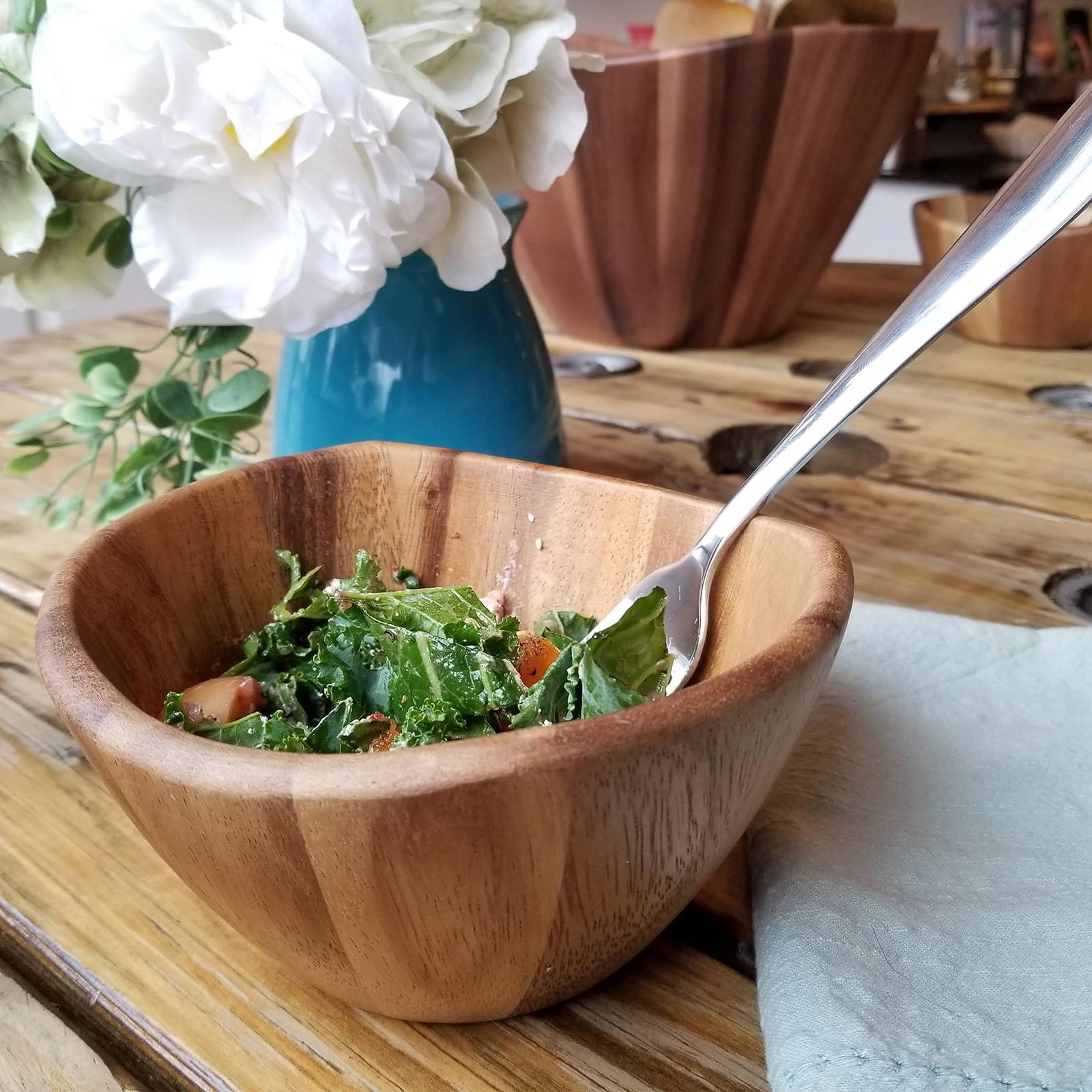 Individual bowls are beautiful as serving bowls for fruits and salads. Contemporary wave design. Generously sized. Made from durable and environmentally friendly Acacia wood.
