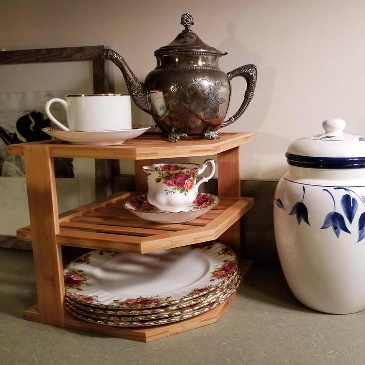 Add more space to your cabinets with this three-tier corner shelf. Perfect for organizing plates and bowls. Also great in the linen closet to organize hand towels. Also great in the linen closet to organize hand towels. Handsome enough to use on counters too! Complements any decor. Made of environmentally friendly bamboo.