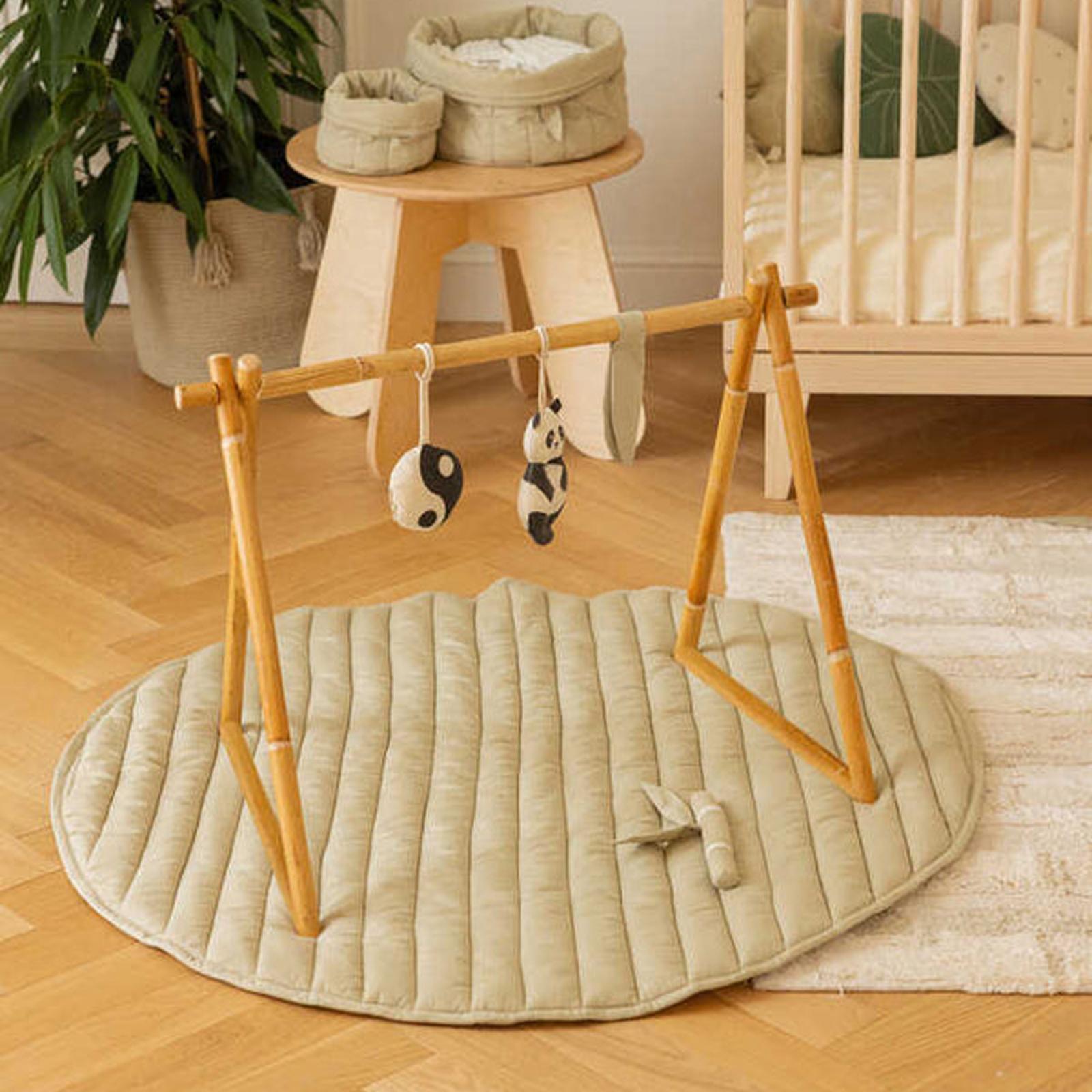 Transform your nursery into a playful bamboo forest with this adorable reversible playmat. Made with soft organic cotton poplin and featuring hand-quilted vertical lines that simulate canes, it's the perfect place for your little one to explore and play. And to make things even more fun, it comes with a sensorial rattle toy in the shape of a cane with leaves. Reversible multi colors, the playmat is filled with certified GRS poly fill and is sure to become a beloved part of your nursery decor.