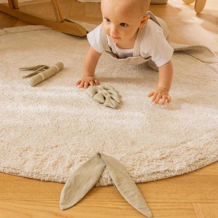 Welcome to the Bamboo Leaf Rug, the perfect addition to your little one's nursery. This extra soft round rug has a slightly higher pile, forming a natural border that simulates canes. Plus, it comes with a piece of sensorial bamboo leaves that are easily removable, which contain crinkle paper for additional sensory stimulation. These leaves are made of GOTS-certified cotton, so you can trust that they are safe for your baby. This rug is not only practical but also stylish and playful, making it a great addition to your baby's room.