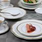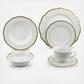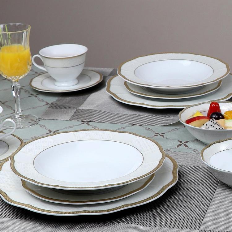 This elegant and sophisticated wavy fine china dinnerware set adds a modern touch to a traditional look. Fine ivory border with a trim edge adds a simple but finished look while still maintaining an old world style. Create a new and exciting look with a wavy shape dinnerware set.