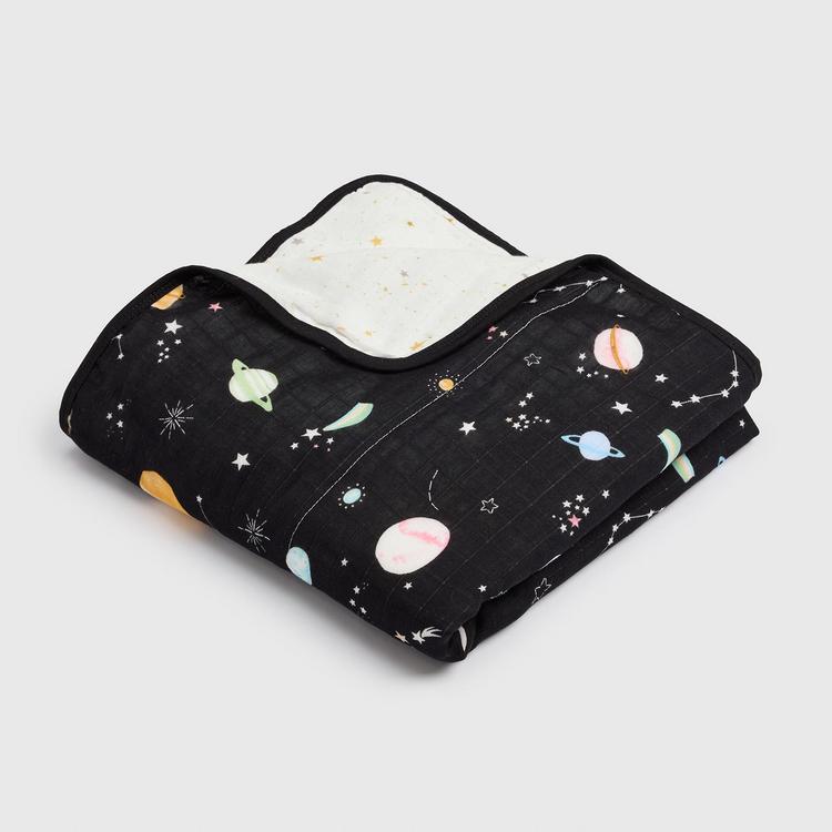 Our muslin quilts made from four layers of bamboo and cotton muslin fabric offer the perfect amount of breathable warmth and coziness to keep the baby comfortable and relaxed. This large reversible blanket is lightly quilted and features hand-drawn watercolor prints. Our multi-purpose muslin quilt blankets are generously sized.
