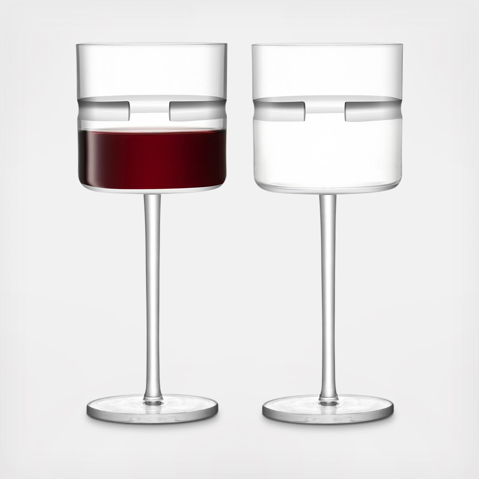Wine glasses with thick stems, cylindrical bowls and hand-cut decoration, mouth blown and handmade by master glassblowers.