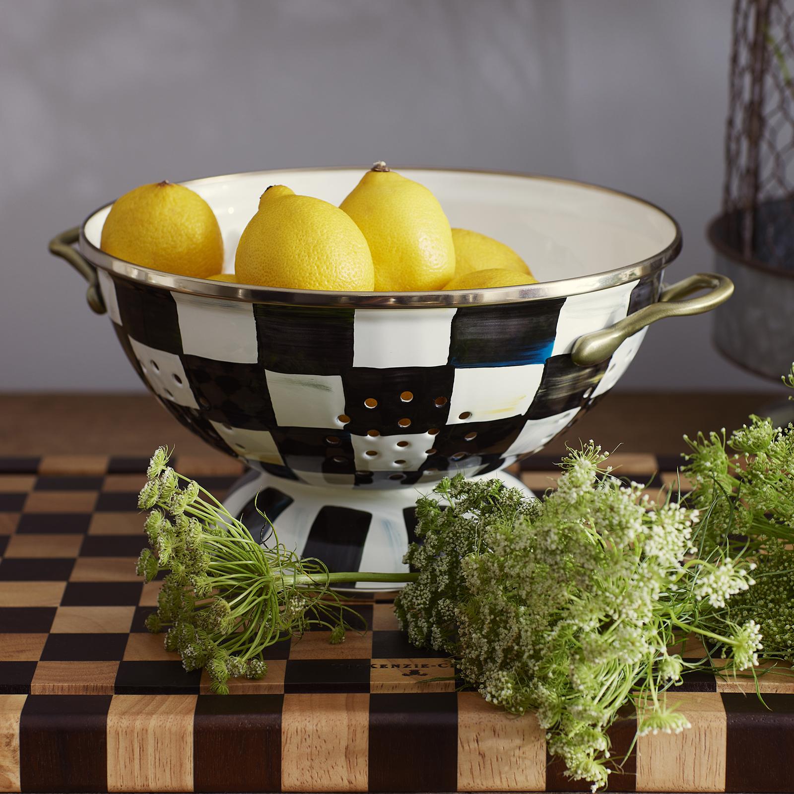 Give stainless steel’s impersonal style and plastic’s halfhearted work ethic the pink slip because there is a commanding new sous chef in town. For kitchen preparations with personality, look no further than the Large Courtly Check® Enamel Colander. The hand-painted enamel checks and antiqued brass handles gives some pizzazz to polishing potatoes and sass to straining salads. Fill with veggies grown in your own garden or clementines for a perfect hostess gift. With a subtle jewel-tone palette woven by an artisan’s brush through the glossy, hand-painted, high-contrast checks, we have yet to find a color (or food!) that doesn’t look good with Courtly Check.