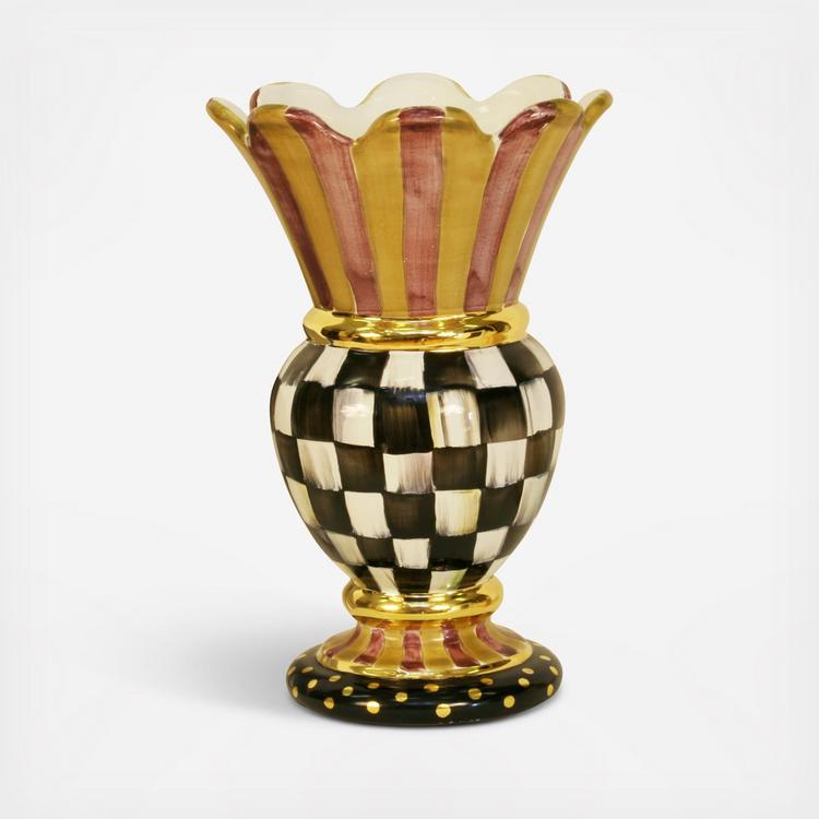 Great lines. Great gift. Our handcrafted Great Vase, mixing color-dragged Courtly Checks®, vibrant stripes, and gold lustre accents is hand-painted by our artisans here in Aurora. Turn it over and you’ll see the stamps of each of the artisans who had a hand in its creation. Generously sized for an impressive presentation.