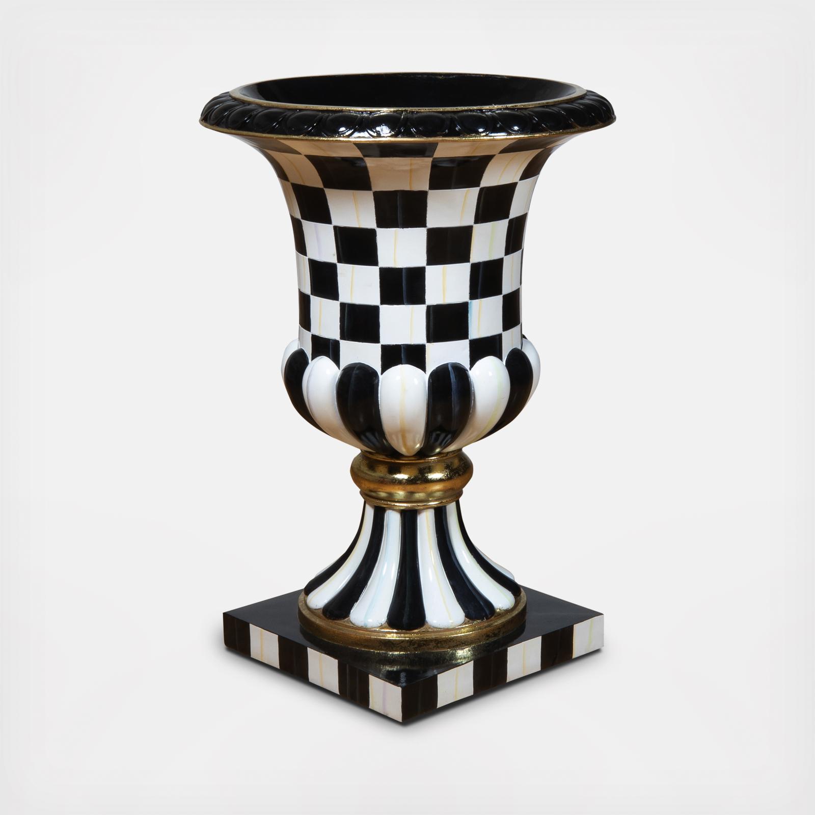 Elevate the presentation of our stacked seasonal accents with the weather-resistant Pedestal Urn. Crafted of durable fiberglass and resin, it is hand-painted with our signature Courtly Checks. There is a drainage hole in the bottom, so you can add your own plants as well.