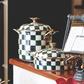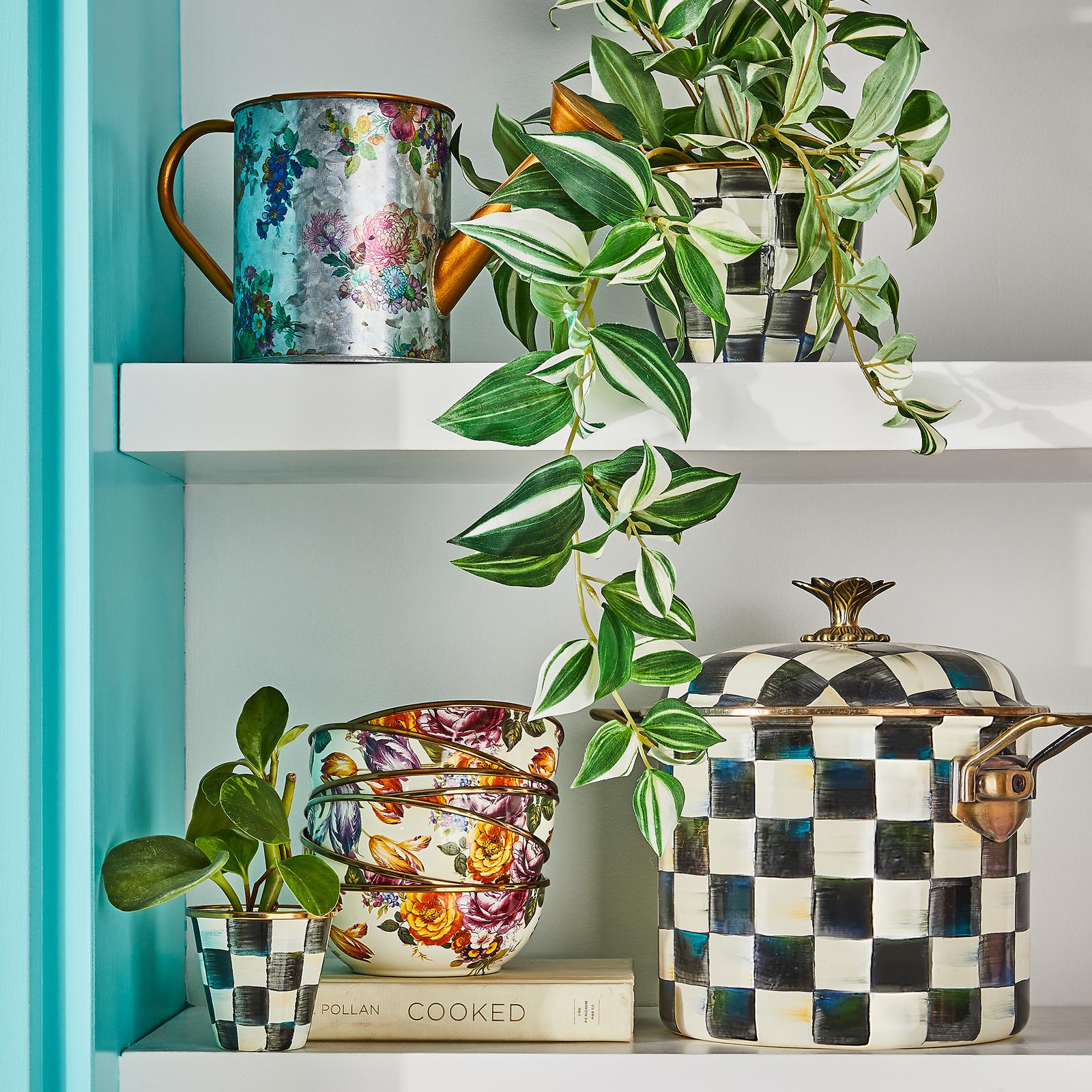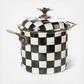 From stovetop to tabletop, our Courtly Check® Enamel 7 Qt. Stockpot transitions with more than a dash of panache. Imagine how your signature soups and stews will stand out when served up in a dish bedecked with our signature black and white pattern. And to top it all off, a blossoming bud sprouts up to serve as a knob, as unique as it is useful.