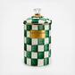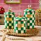 Pantry staples—flour, sugar, and coffee—might seem the most obvious choices with which to fill an Emerald Check Canister, but the possibilities are endless! Keep it in the kitchen with coffee beans and tea bags, cookies and candies, or dog biscuits and birdseed—or invent new uses around the house. Each enameled steel canister is hand-painted with green checks and topped with an elegant clear glass knob. Silicone seal inside lid. Pieces may vary due to the handmade nature of each product.