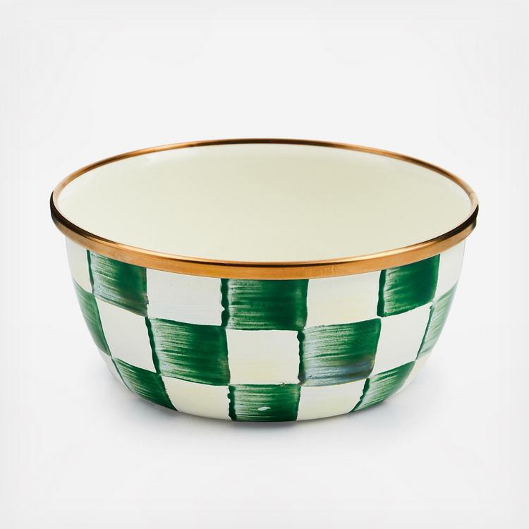 Our Emerald Check Pinch Bowl makes prep work a stylish snap. This petite enamel piece is equally charming when brimming with paper clips in a home office or lemon wedges on the wet bar. The heavy-gauge steel underbody is glazed with hand-painted green checks and rimmed in bronzed stainless steel. Pieces may vary due to the handmade nature of each product.