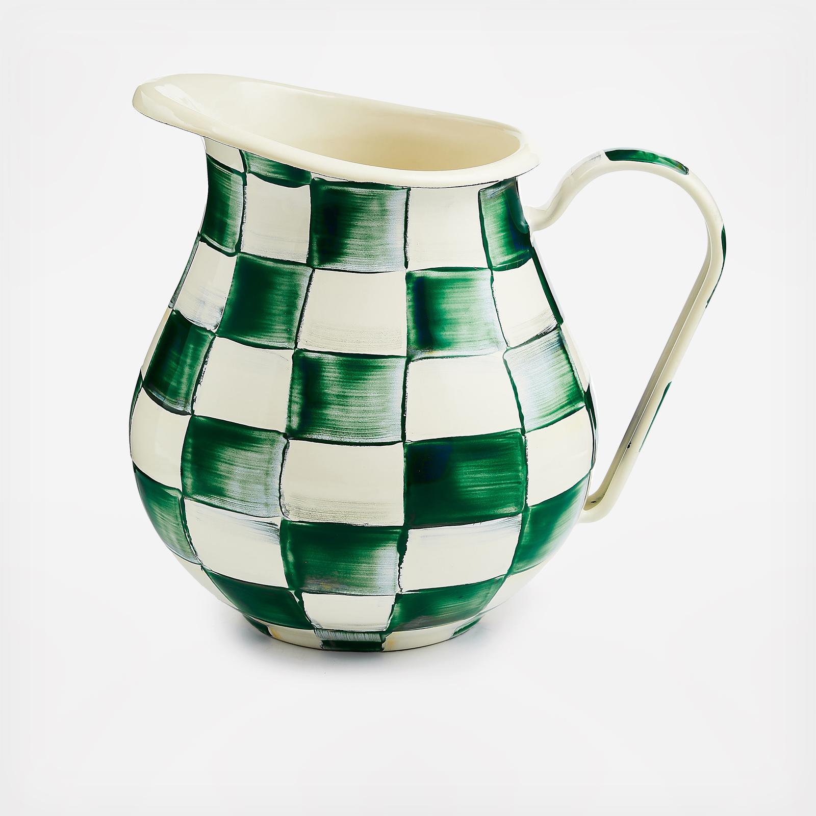 For ice water, fresh-squeezed lemonade or a refreshing punch, our Emerald Check Enamel Pitcher dresses up the bar or dinner table. The heavy-gauge steel underbody is glazed with hand-painted green checks. Pieces may vary due to the handmade nature of each product.