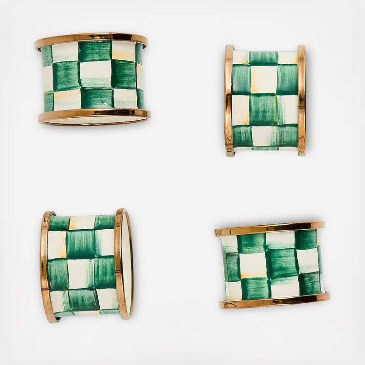 Add a touch of elegance to your table setting with our Emerald Check Napkin Rings, sold as a set of four. Crafted from heavy-gauge, hand-glazed steel, these rings are hand-painted with our signature Emerald Checks and rimmed in bronzed stainless steel for a refined finish. Perfect for both casual and formal occasions, this set brings a stylish, coordinating element to your dining experience, while each piece’s handmade nature ensures a unique touch.