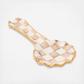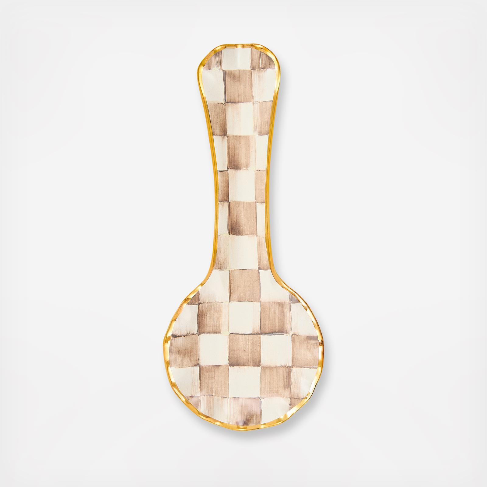 Our Mocha Check Ceramic Spoon Rest holds a special place in our hearts. Features hand-painted checks in mocha hues with a trim of gold lustre. Handmade in Aurora, NY.