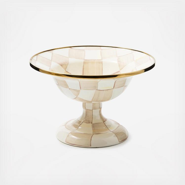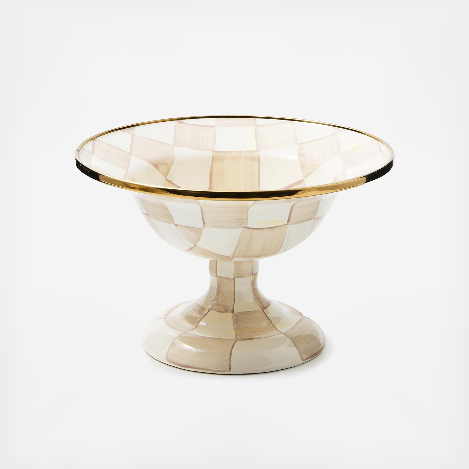 An indispensable party serving dish, the Mocha Check Compote is decorated with hand-painted, coffee-colored checks. It has a steel underbody and bronzed stainless-steel rim. Pieces may vary due to the handmade nature of each product.