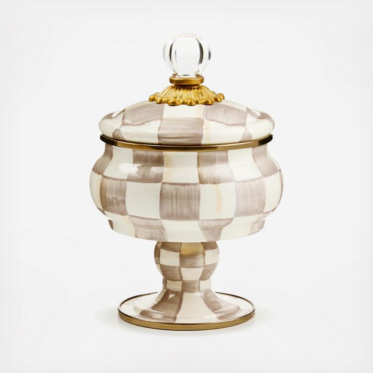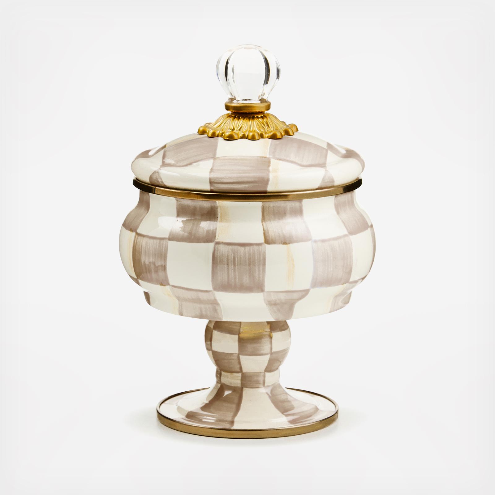 For housing treasured trinkets, there’s no container more charming than our Mocha Check Curiosity Pot. The handsome curved pot with a perfectly matched pedestal is dressed in our hand-painted, coffee-colored checks and topped off with a lid featuring a clear glass knob. Pieces may vary due to the handmade nature of each product.
