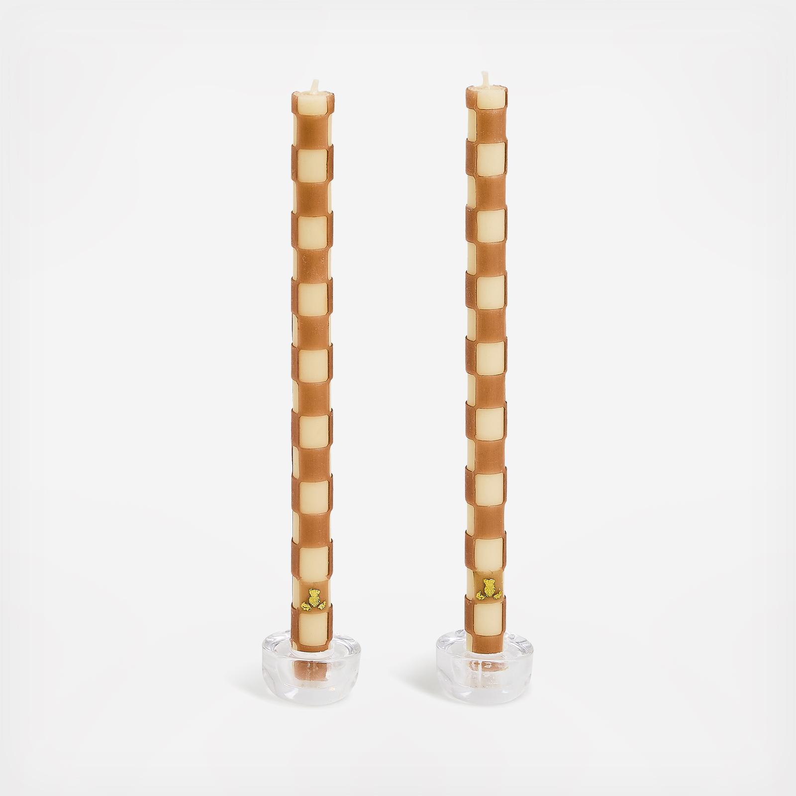 This hand-rolled, beeswax-blend Mocha Check Dinner Candles Set is absolutely enlightening on your tabletop or mantel. Features our warm, espresso-inspired Mocha Check pattern and pairs perfectly with our variety of candlesticks. Burn Time: 11 Hours.