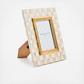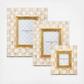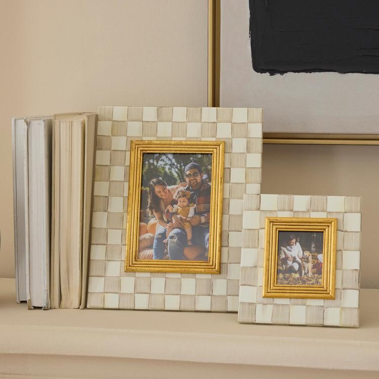 The picture-perfect Mocha Check Frame features hand-painted Mocha Checks on a steel underbody and is backed with linen with a brass logo plate. Its elegant design makes it a stunning way to display your favorite photos or cherished memories, adding a touch of warmth and charm to any room.