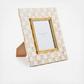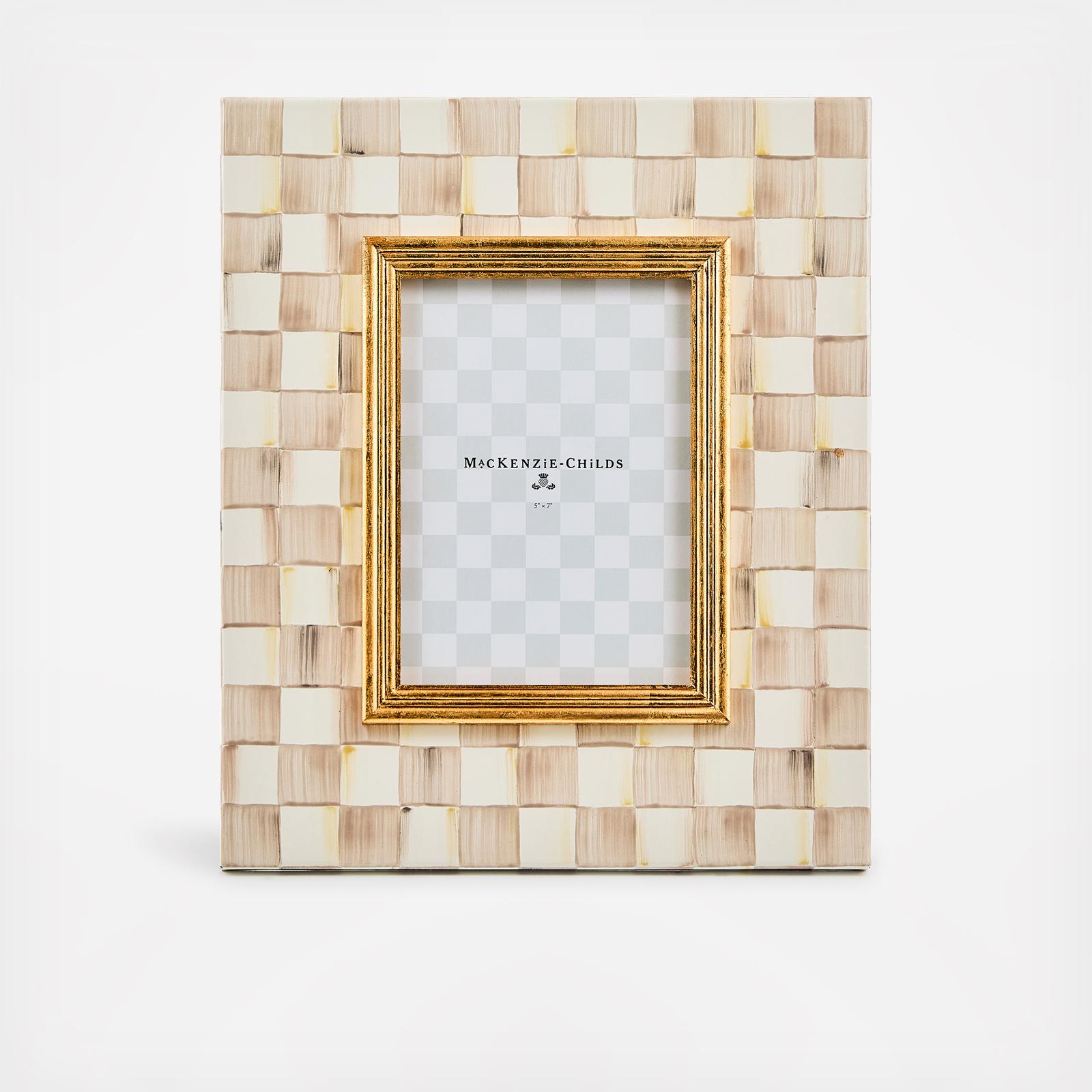 The picture-perfect Mocha Check Frame features hand-painted Mocha Checks on a steel underbody and is backed with linen with a brass logo plate. Its elegant design makes it a stunning way to display your favorite photos or cherished memories, adding a touch of warmth and charm to any room.