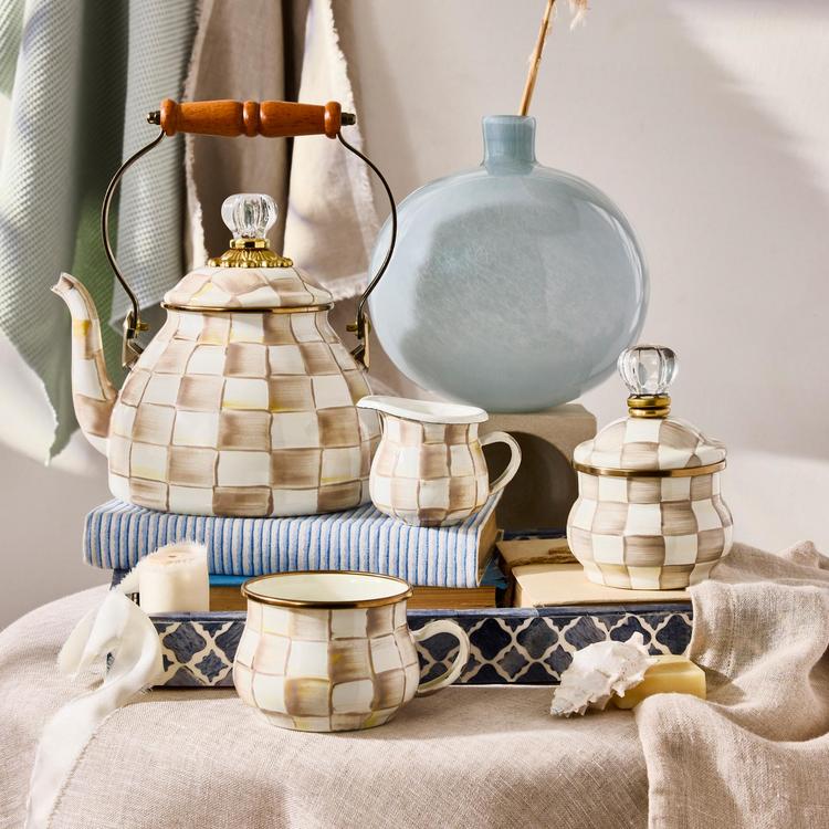 Hearty and handy, our handsome Mocha Check Mug is perfect for a cup of hot chocolate or calming tea. Similar in theme to our signature Courtly Check® enamel pattern, Mocha Check features hand-painted, coffee-colored checks that are rimmed in bronzed stainless steel. Pieces may vary due to the handmade nature of each product.
