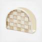 When it comes to staying tidy, our Mocha Check Napkin Holder makes table style a snap. It features heavy-gauge, hand-glazed steel underbody with hand-painted, coffee-colored checks. Pieces may vary due to the handmade nature of each product.