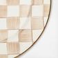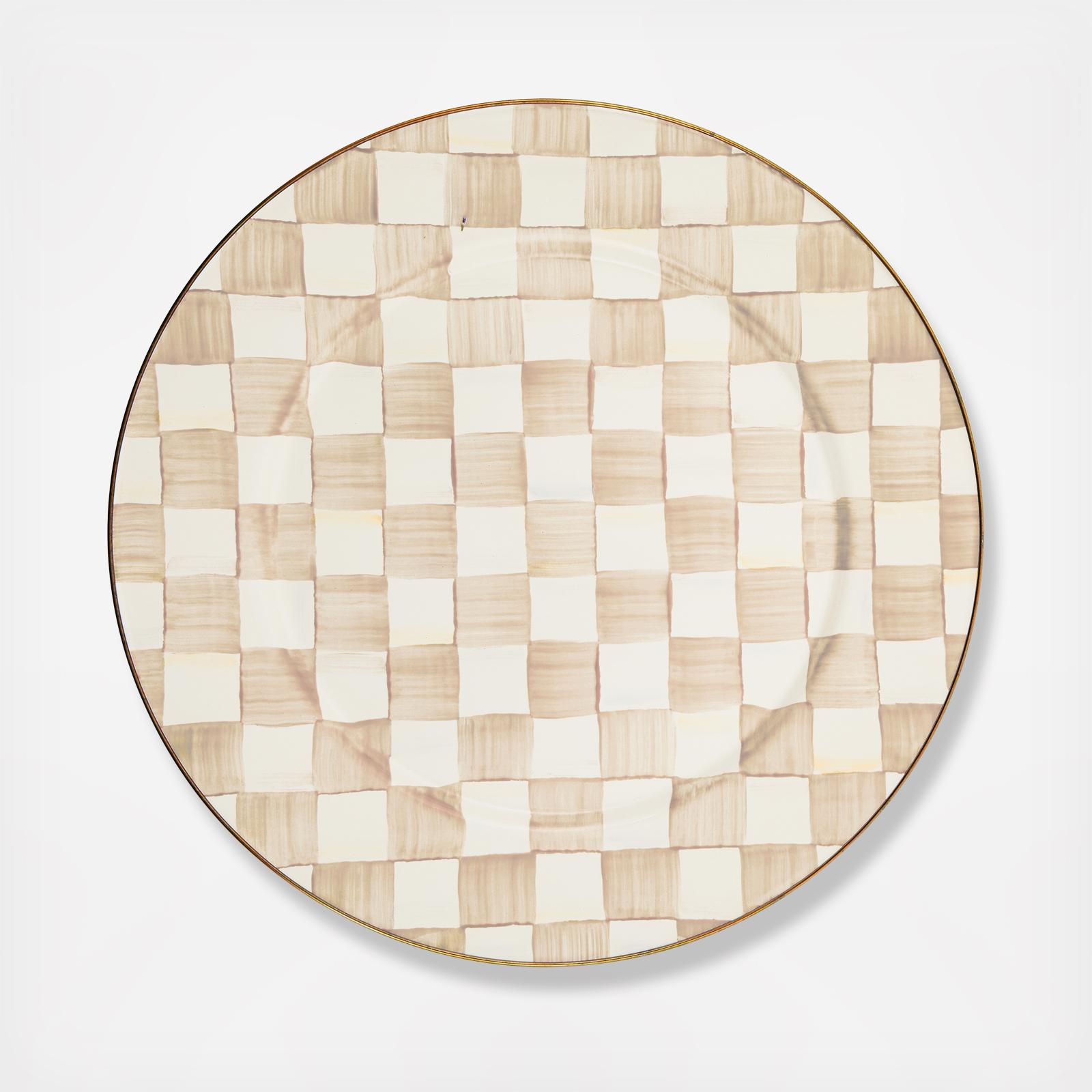 Serve your favorite dishes in style with our Mocha Check Serving Platter. The heavy-gauge steel underbody is glazed with hand-painted, coffee-colored checks and rimmed in bronzed stainless steel. Pieces may vary due to the handmade nature of each product.