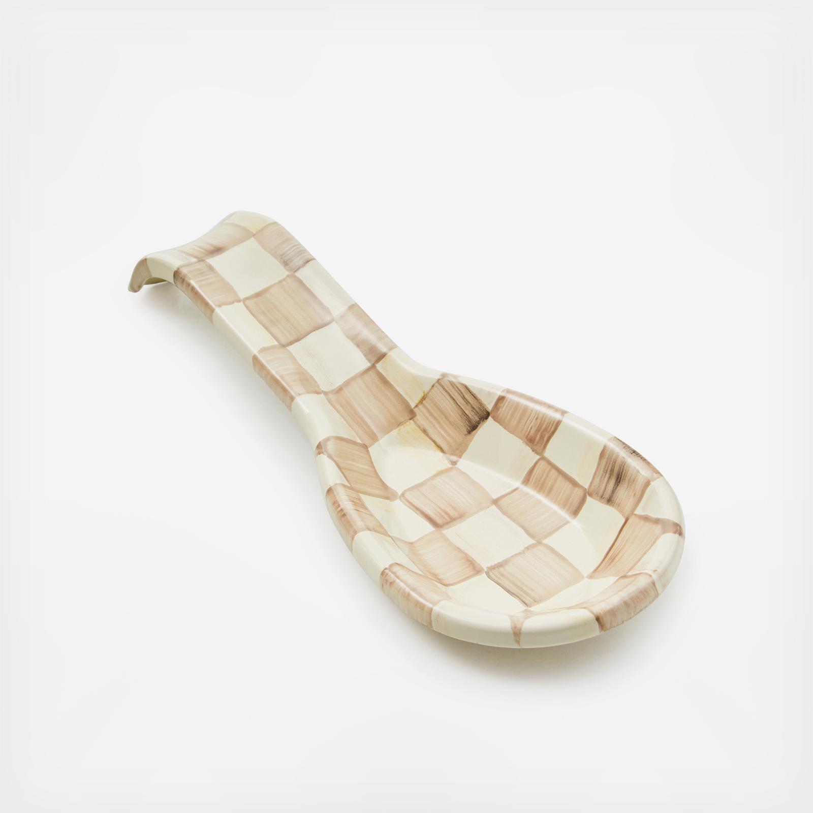 Stir up signature style with our Mocha Check Spoon Rest. This handsomely curved enamel piece, bedecked in hand-painted, coffee-colored checks, always stands by to tidy up the counter. From quick work-night stir-fries to long-simmering weekend stews, this elevated kitchen helper works in style all week long. Pieces may vary due to the handmade nature of each product.