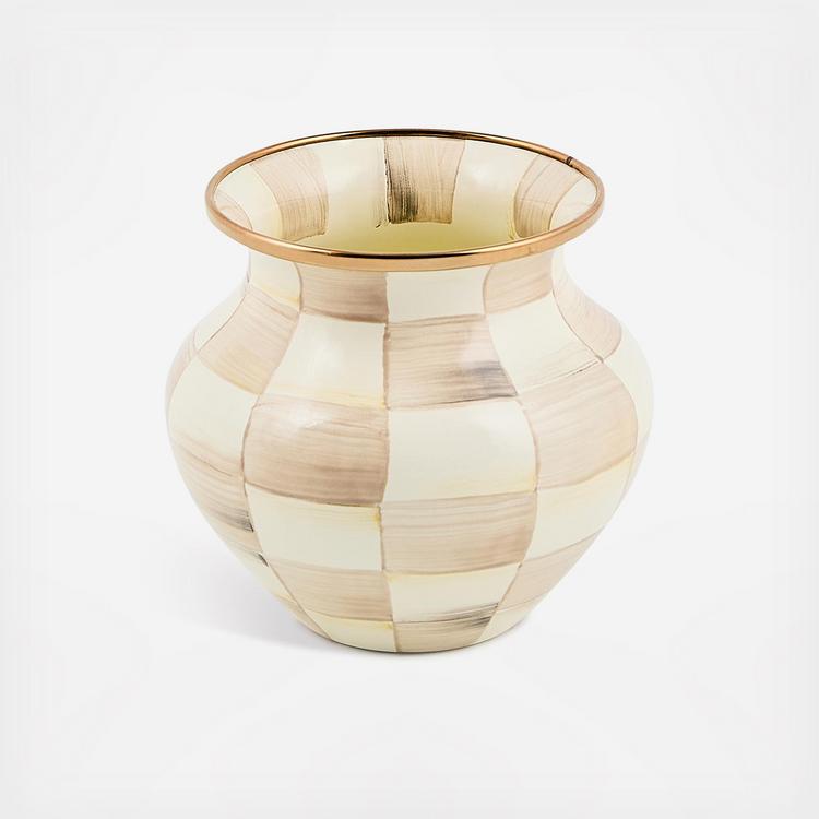Petite and poised, for flowers, paintbrushes, pencils … (you might need more than a few!). The sturdy steel underbody of our Mocha Check Vase is adorned with hand-painted Mocha Checks and rimmed in bronzed stainless steel.