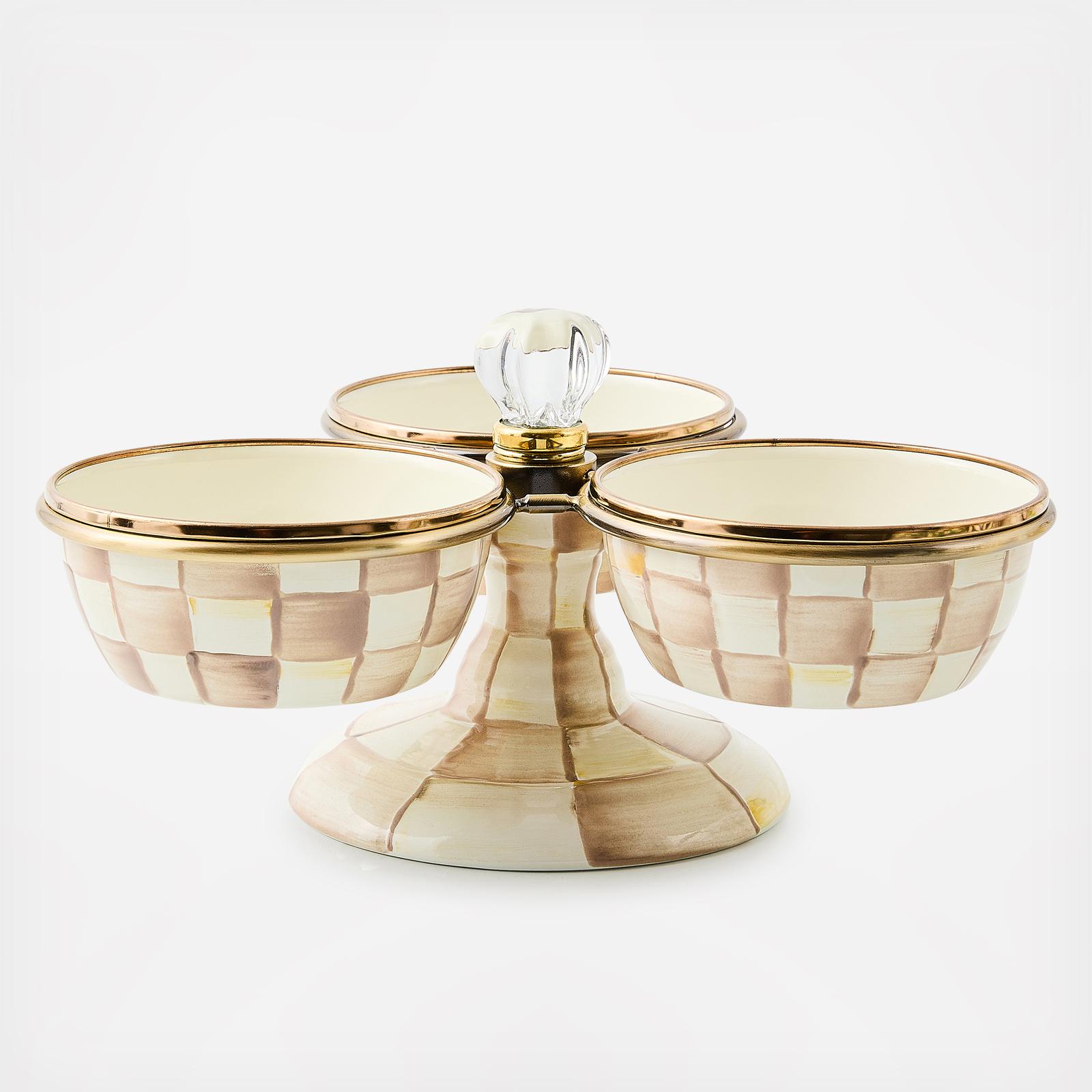 The Mocha Check Triplicity brings a little height to your kitchen displays while saving on precious counter space. The stand and accompanying 1.5 cup Pinch Bowls are hand-glazed, heavy-gauge steel with hand-painted Mocha Check decoration. The bowls remove from the stand for easy cleaning.