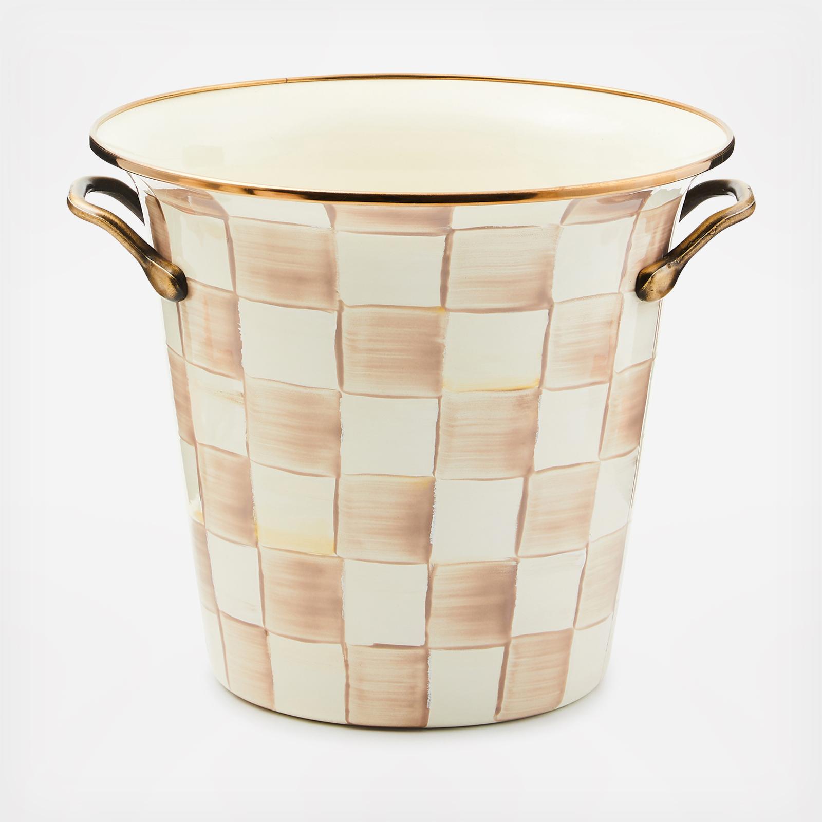 Chilling wine is just the warm-up act for the Mocha Check Wine Cooler, hand-painted in coffee-colored checks. Fill it with showy sunflowers, sand to hold candles, or popcorn for movie night. Pair with a fine vintage wine and a set of our hand-painted glasses for a memorable gift. Antiqued brass handles. Pieces may vary due to the handmade nature of each product.