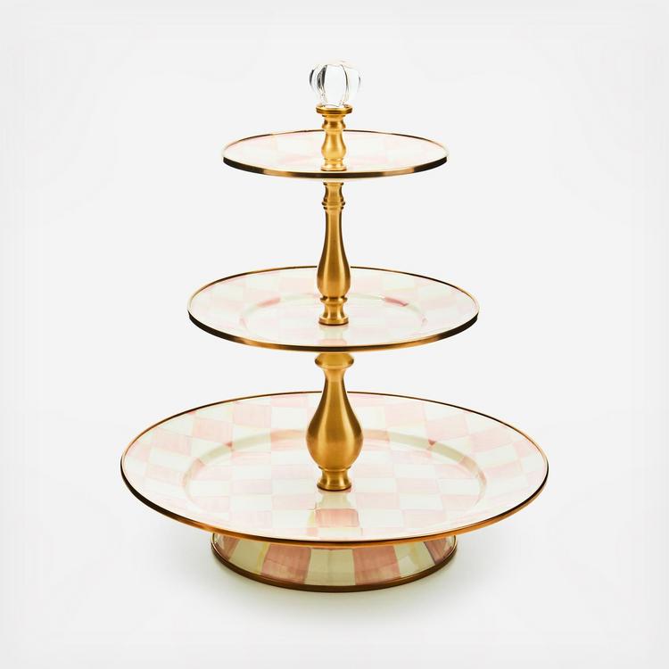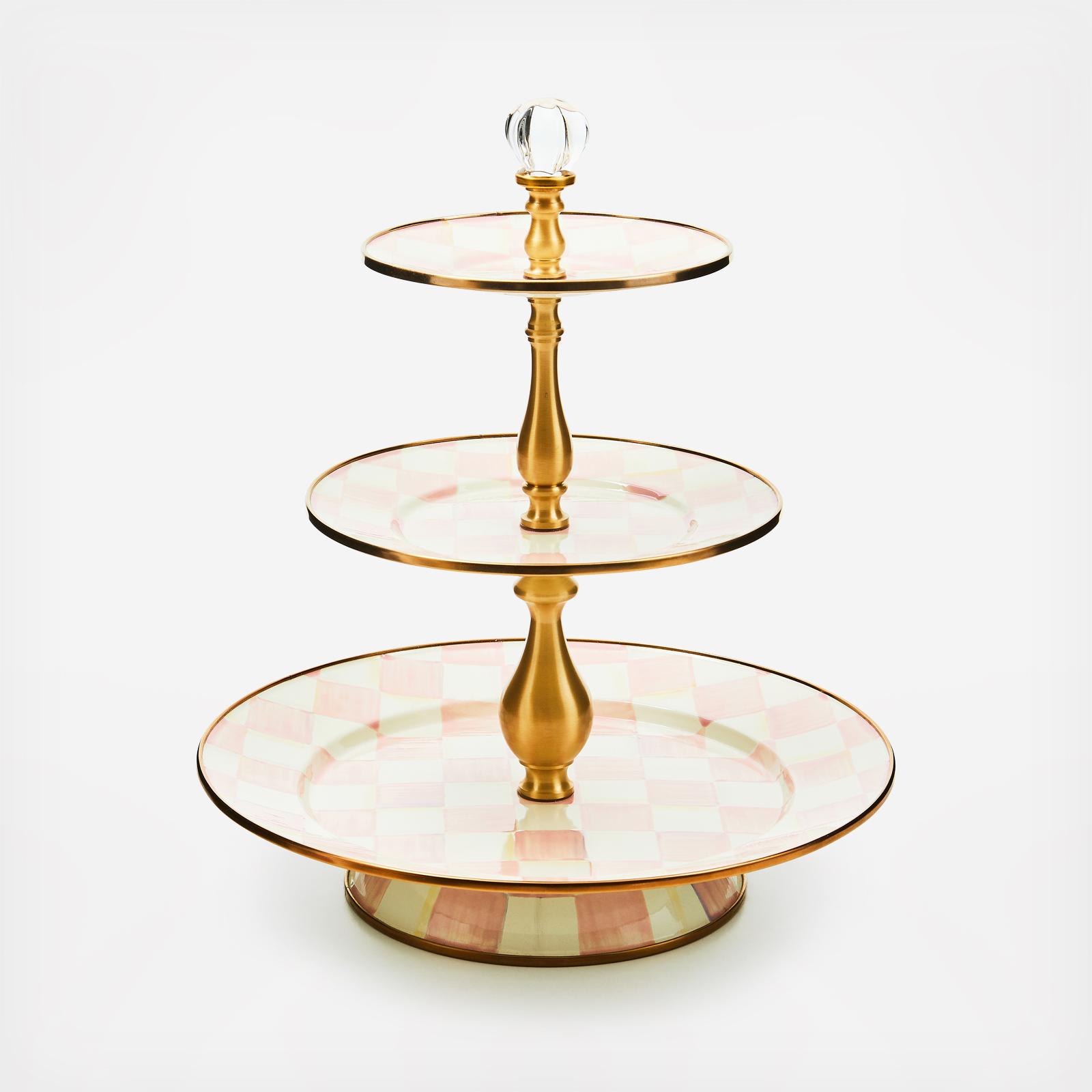Covered in cupcakes for your princess’s party, or scones and biscotti for your morning coffee club, the Rosy Check® Enamel Three Tier Sweet Stand is sure to stand out. It features hand-painted pink checks on enameled steel, crowned with a glass knob. Pieces may vary due to the handmade nature of each product.