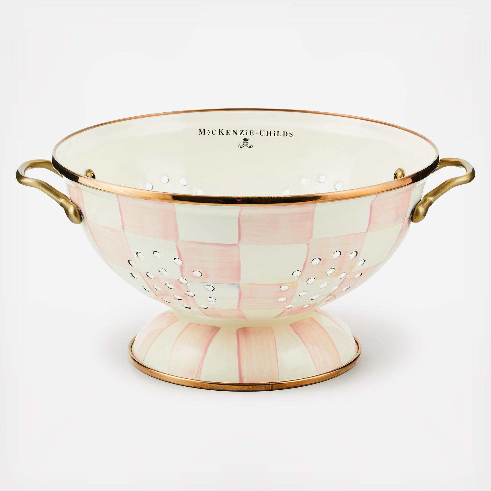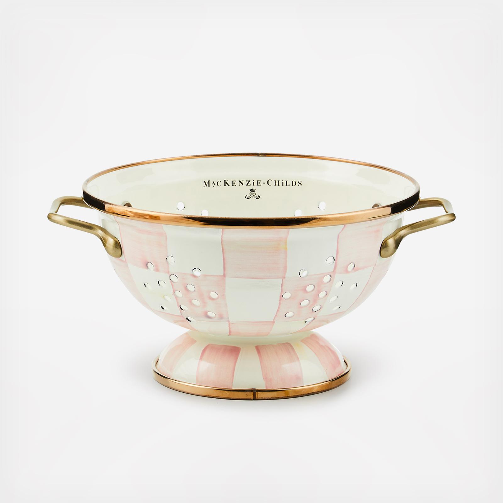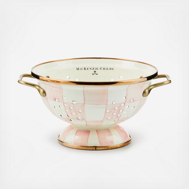 For kitchen preparations with personality, look no further than the Rosy Check Enamel Colander. The steel underbody makes this number a workhorse, and the hand-painted, color-dragged checks in a range of rosy hues and antiqued brass-finish handles give some pizzazz to scrubbing potatoes and sass to straining salads.