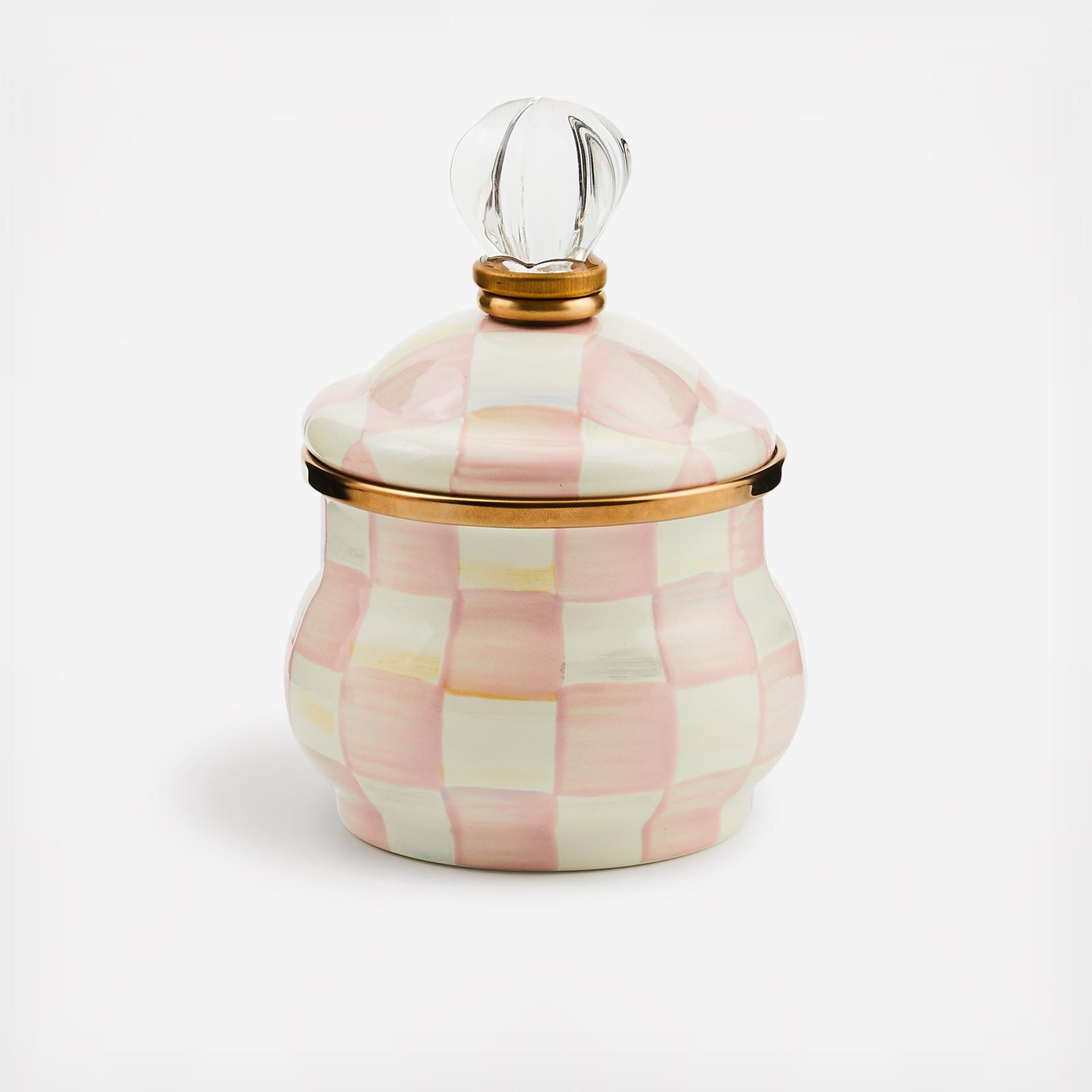 Taking your lumps becomes a delight with our Rosy Check Enamel Lidded Sugar Bowl-the only question is, one cube or two? And why stop at sugar-this lidded enamel bowl is perfect for jam or sauces, or to hold anything from cotton balls to paper clips. The heavy-gauge steel underbody is glazed with hand-painted, color-dragged checks in a range of rosy hues, rimmed in bronzed stainless steel, and topped with a clear glass knob.