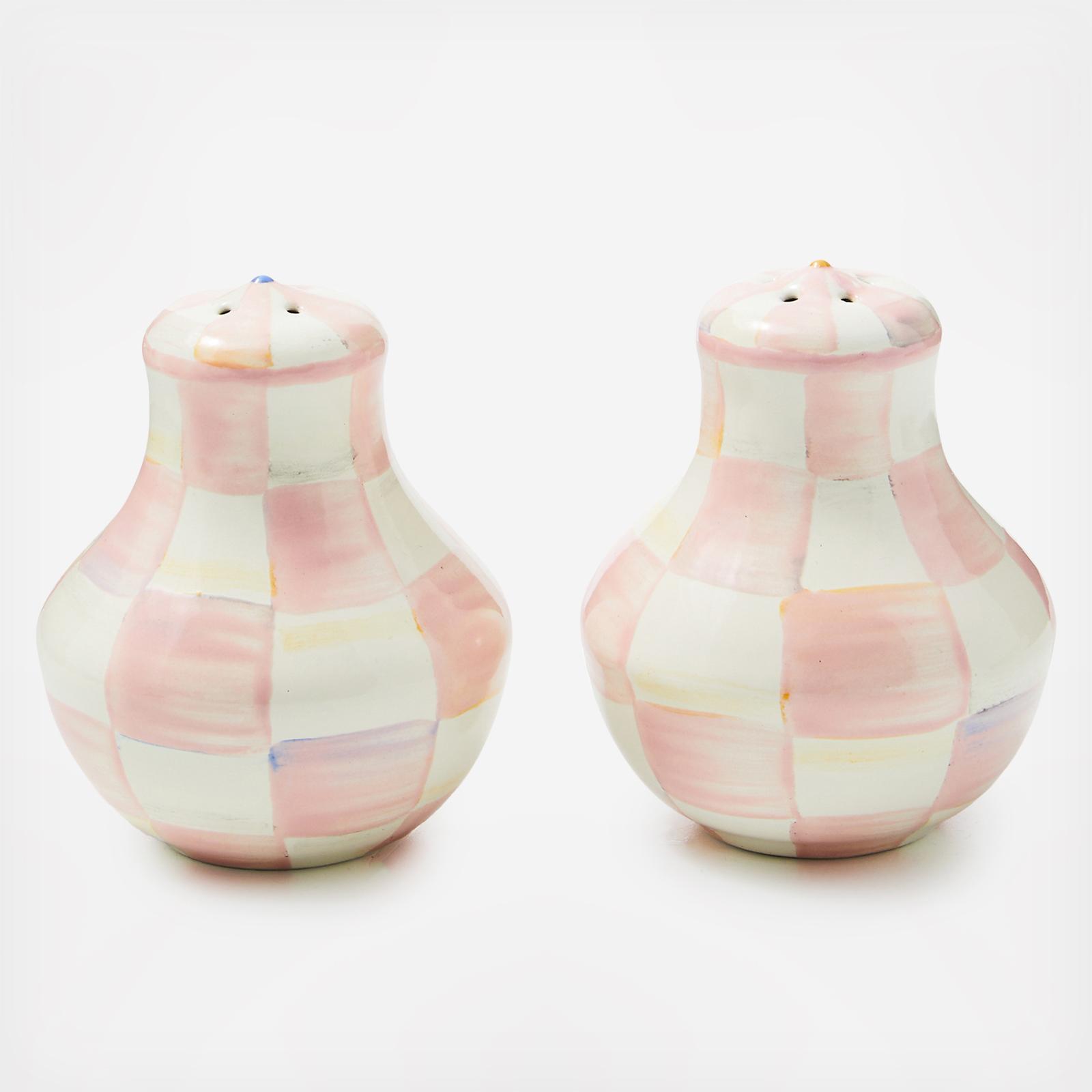 Spice up your table with Rosy Check Salt & Pepper Shakers, done in our rosy and white pattern that complements any kitchen decor. This stylish set features a subtle jewel-tone palette woven by an artisan’s brush through the glossy, hand-painted checks.