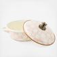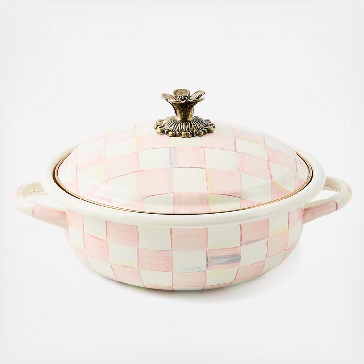 Take the Rosy Check Medium Casserbole right from the oven to the table. The heavy-gauge steel underbody is glazed with hand-painted, color-dragged blush-hued checks. And to top it all off, a charming blossom sprouts up to serve as a knob, as unique as it is useful.