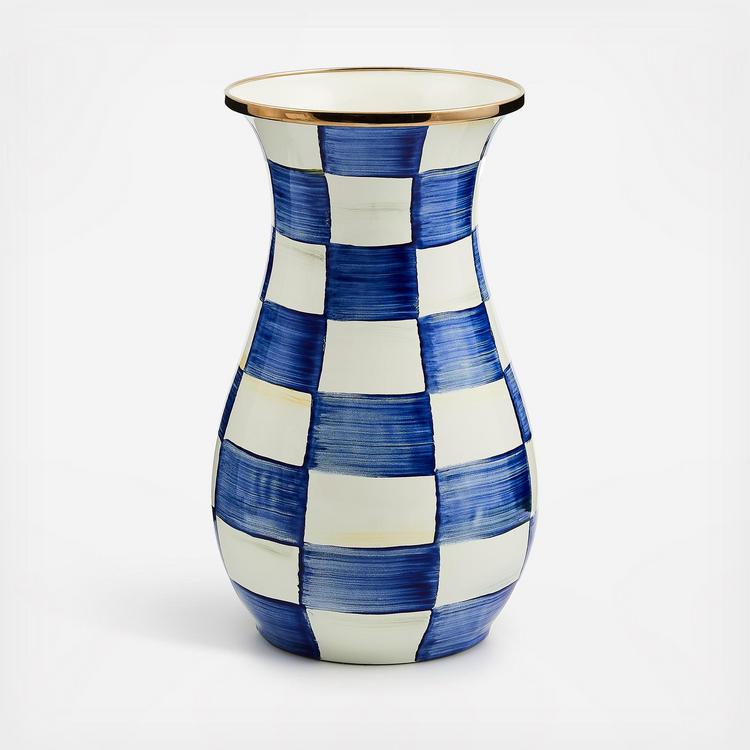 Farm-fresh and inspired by traditional glass milk jugs, the Tall Royal Check Vase is the kind of vase that’s just right for a casual wildflower bouquet, cherry-blossom branches or pussywillow stalks. It's made of hand decorated enameled steel, with a bronzed rim.