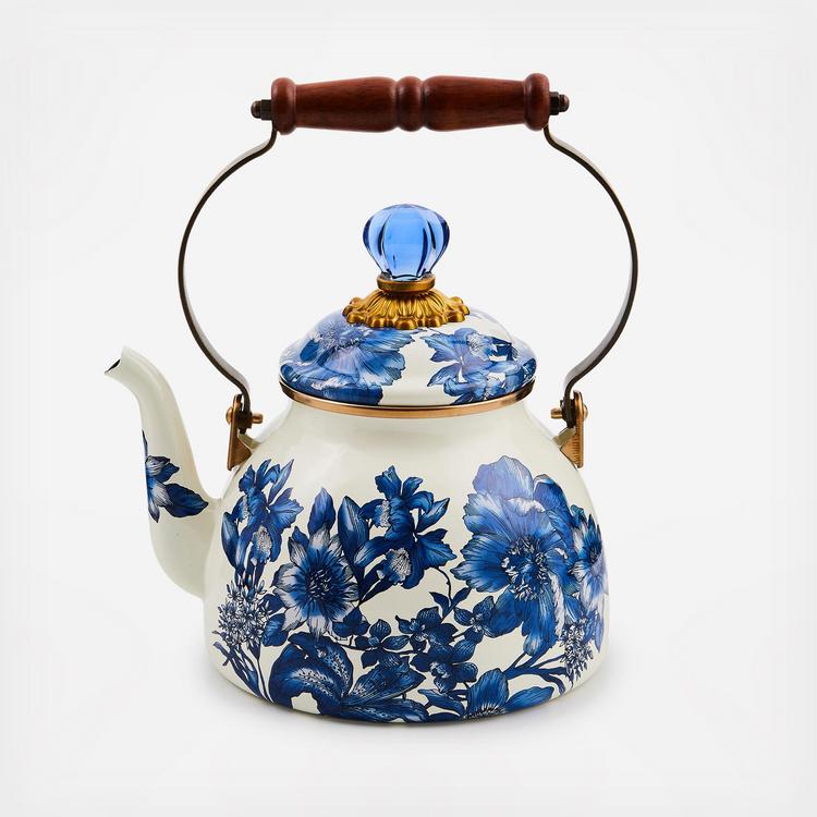 Bubbling over with MacKenzie-Childs style, our Royal English Garden 2 Quart Tea Kettle will have you finding new reasons to put the kettle on to boil. The heavy-gauge steel underbody is decorated with hand-applied floral transfers and rimmed in bronzed stainless steel. It features an acacia wood handle and blue glass-topped lid. It’s gorgeous filled with fresh-cut flowers or greens, too.