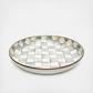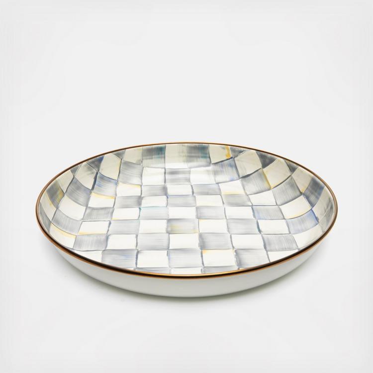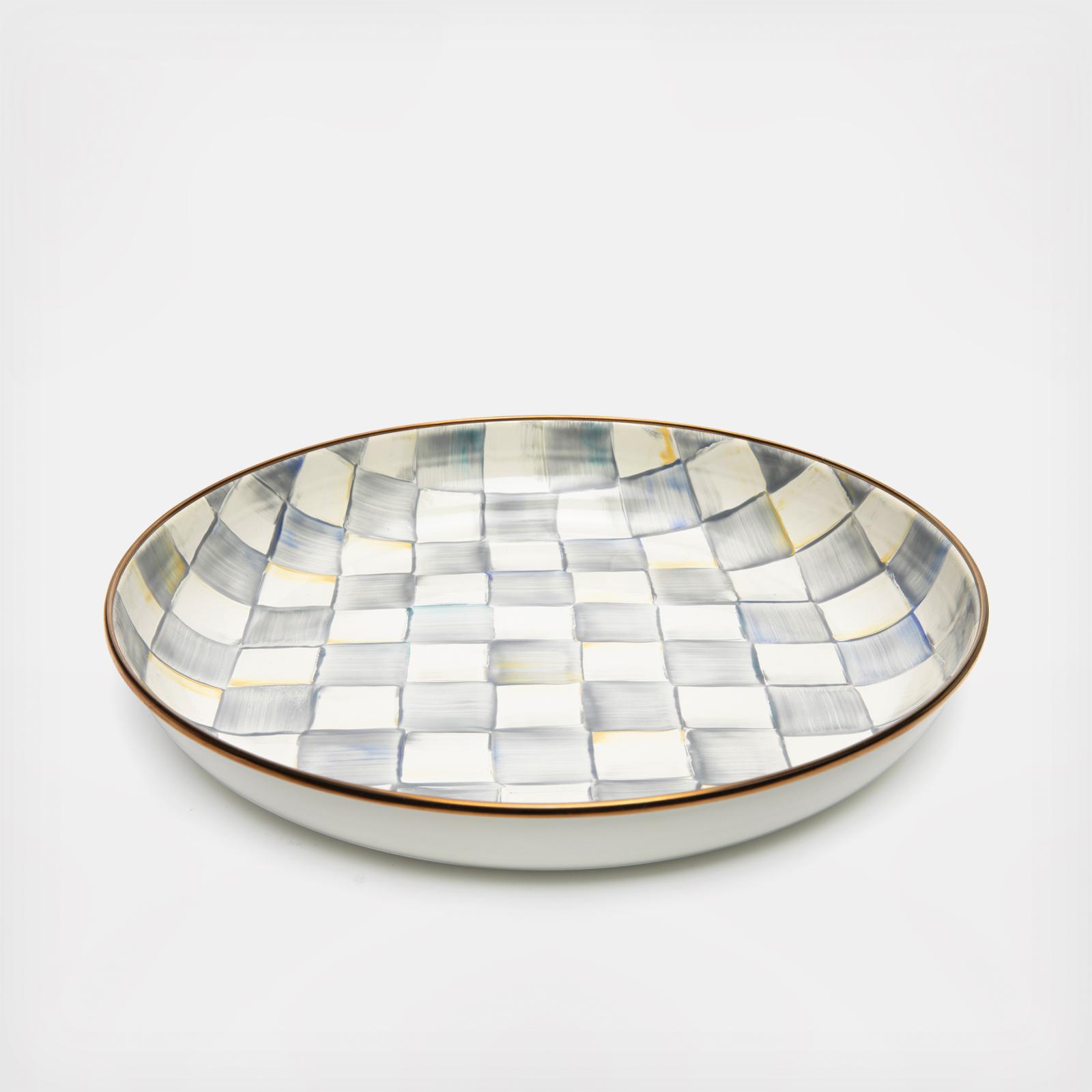 Add a versatile do-it-all piece to your kitchen and table. The Abundant Bowl handles serving in style. Its upturned edge is especially handy for presenting main courses that have a bit more sauce, like a heaping bowl of pasta. Heavy-gauge, hand-glazed steel underbody with hand-painted checks in a range of blue hues and a bronzed stainless-steel rim.