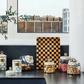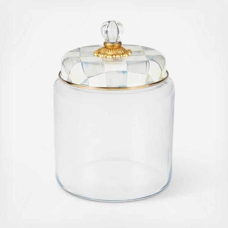 Keep countertops tidy in MacKenzie-Childs style with the Sterling Check Kitchen Canister. With our color-dragged check pattern in a range of grey hues on the hand-painted enamel lid, topped with a pretty, clear glass knob, collect all the convenient sizes to hold countless contents.