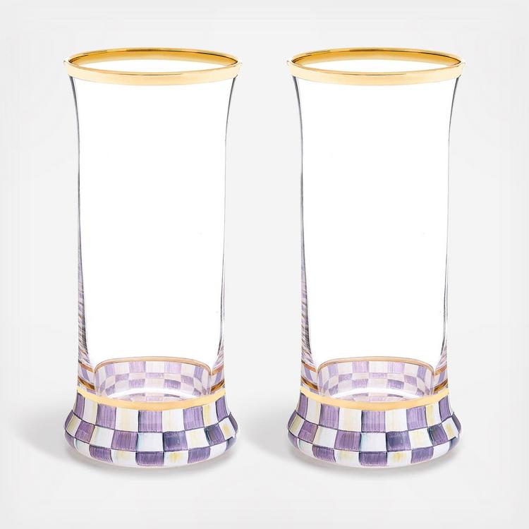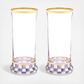 Make any occasion more special by setting the table with our set of two hand-painted Violet Check Highball Glasses. These mouth-blown glasses feature a base of Violet Check that are trimmed with gold lustre.