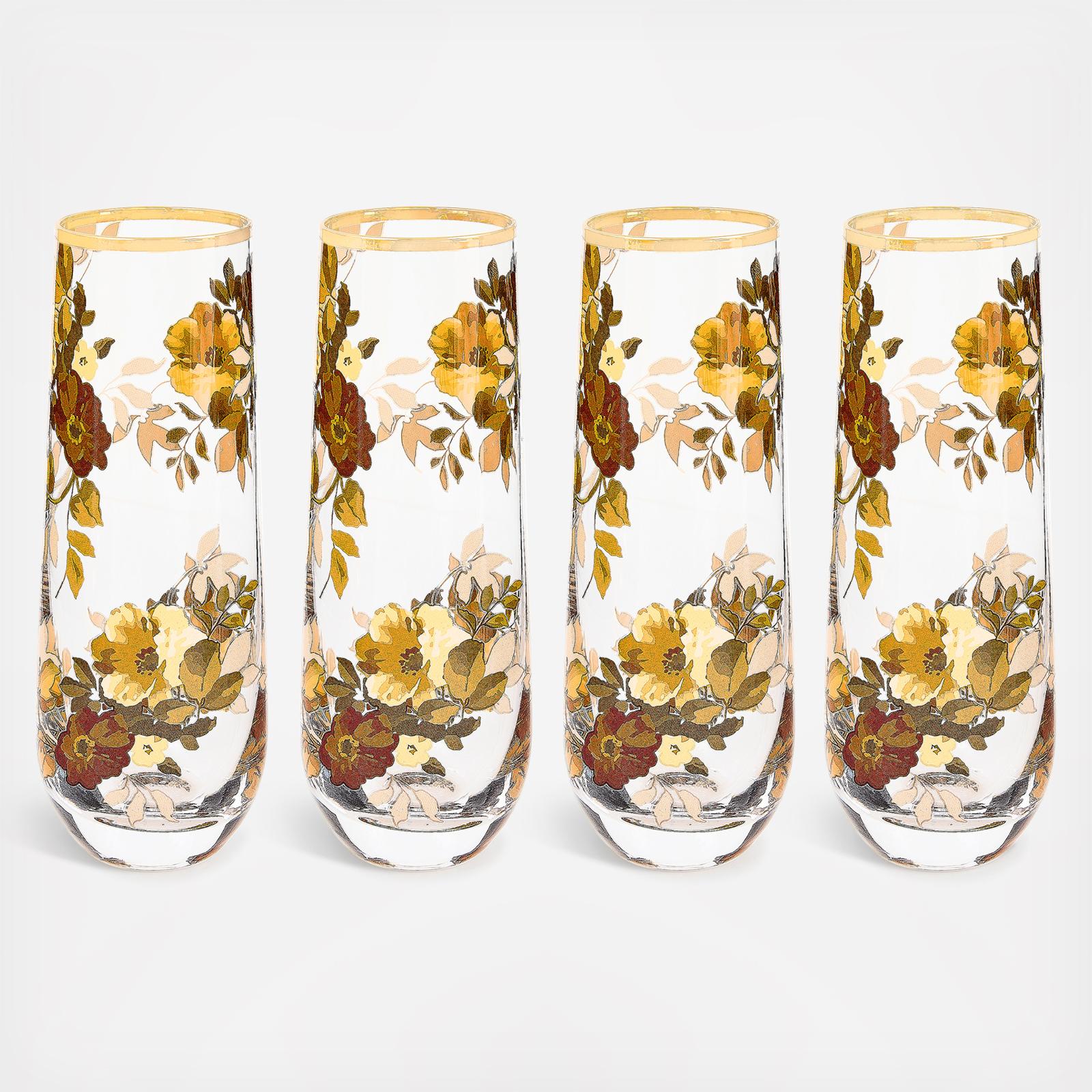 Cheers to beautiful drinkware in MacKenzie-Childs' signature style! Enjoy your favorite vintage with our set of four Wild Rose Stemless Wine Flutes, sold as a set of four. Featuring our stunning hand-applied Wild Rose design and gold lustre embellishment.