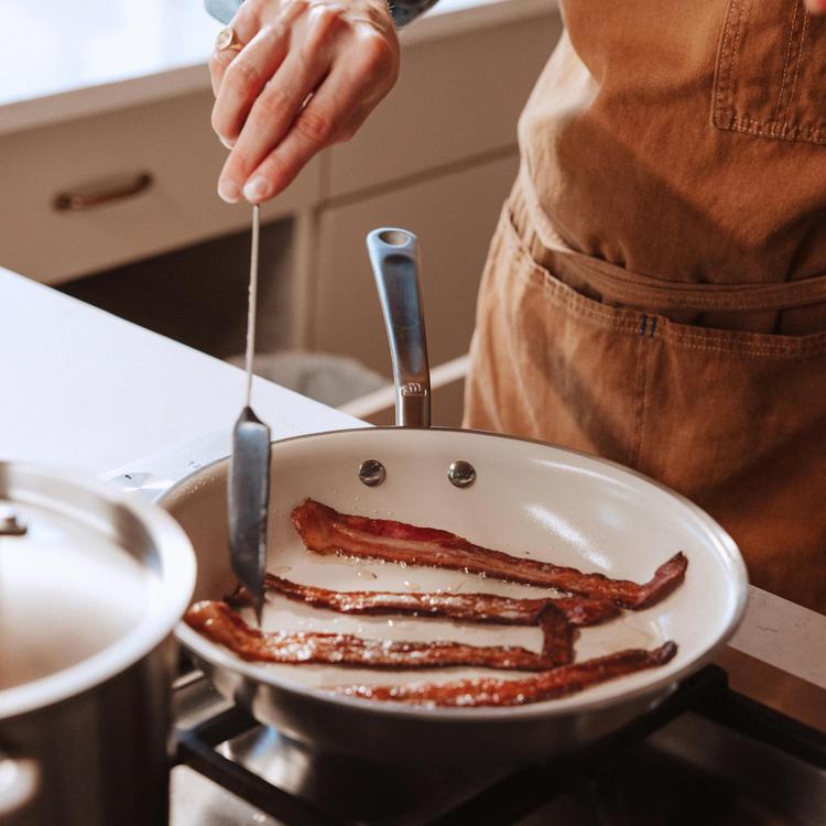 The first of its kind, the CeramiClad™ Frying Pan combines the even and responsive heat control of the Award Winning 5-Ply Stainless Clad Cookware with a proprietary Non Stick ceramic coating. Simple to use and just as simple to maintain, the American-Made ceramic coating is made without PFAS, PFOA, PTFE, lead, and cadmium, making for a clean staple that'll last longer than lower-cost counterparts.