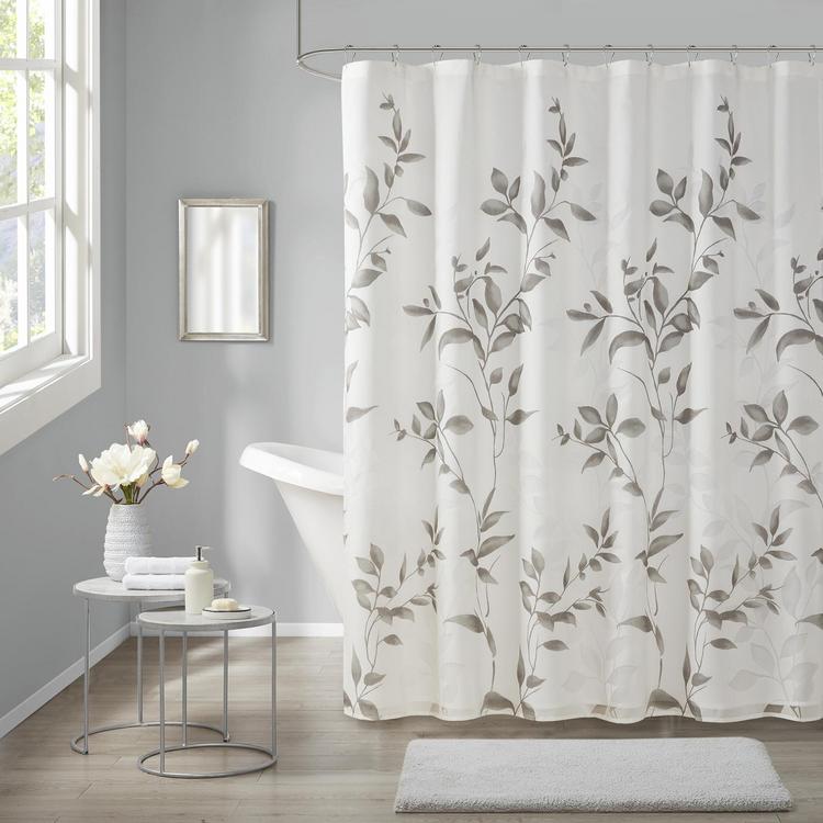 Transform your bathroom with the beauty of Cecily Printed Shower Curtain. The gorgeous shower curtain flaunts a stunning allover grey botanical design with burnout detailing for beautiful contrast and dimension. Non-absorbent water coat will help to bead water on fabric and glide down which provides quick dry and keeps fabric looking tidy, separate liner is still recommended and can be purchased seperately. Complete the look with coordinating Window panel, available and sold separately.
