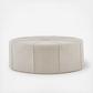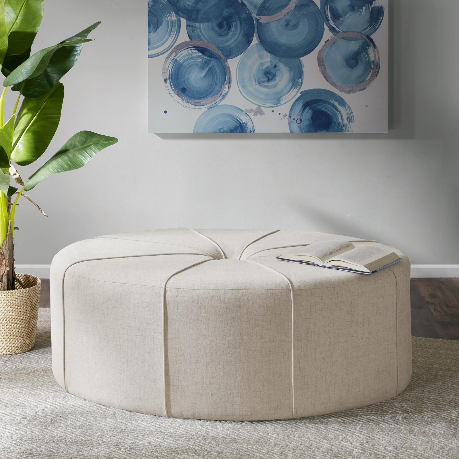 Oversized and in an unexpected shape the Ferris Ottoman will blend into many different decors. Thick welting and center button are topped off with a flannel fabric. No assembly required.