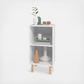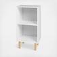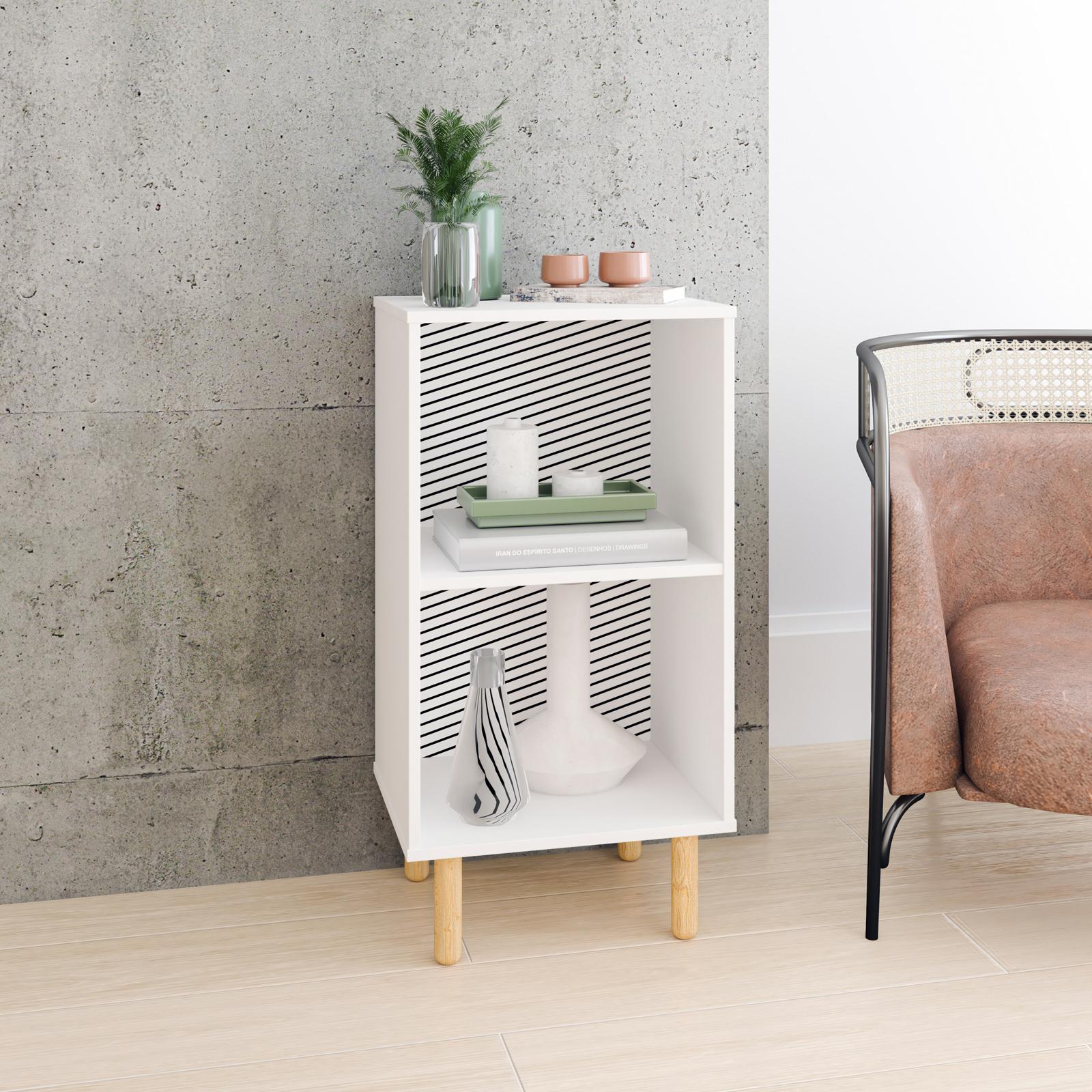 Candles, books, or a favorite lamp are all good for enhancing the Mid-Century Modern Essex nightstand. Light oak rounded peg legs and a black and white backdrop add decorative flair without overpowering a space. Open shelving makes tucking items away or displaying favorite things easy and functional. The perfect bedside accompaniment made simple, this piece will take a bedroom up a notch in style while easily blending in.