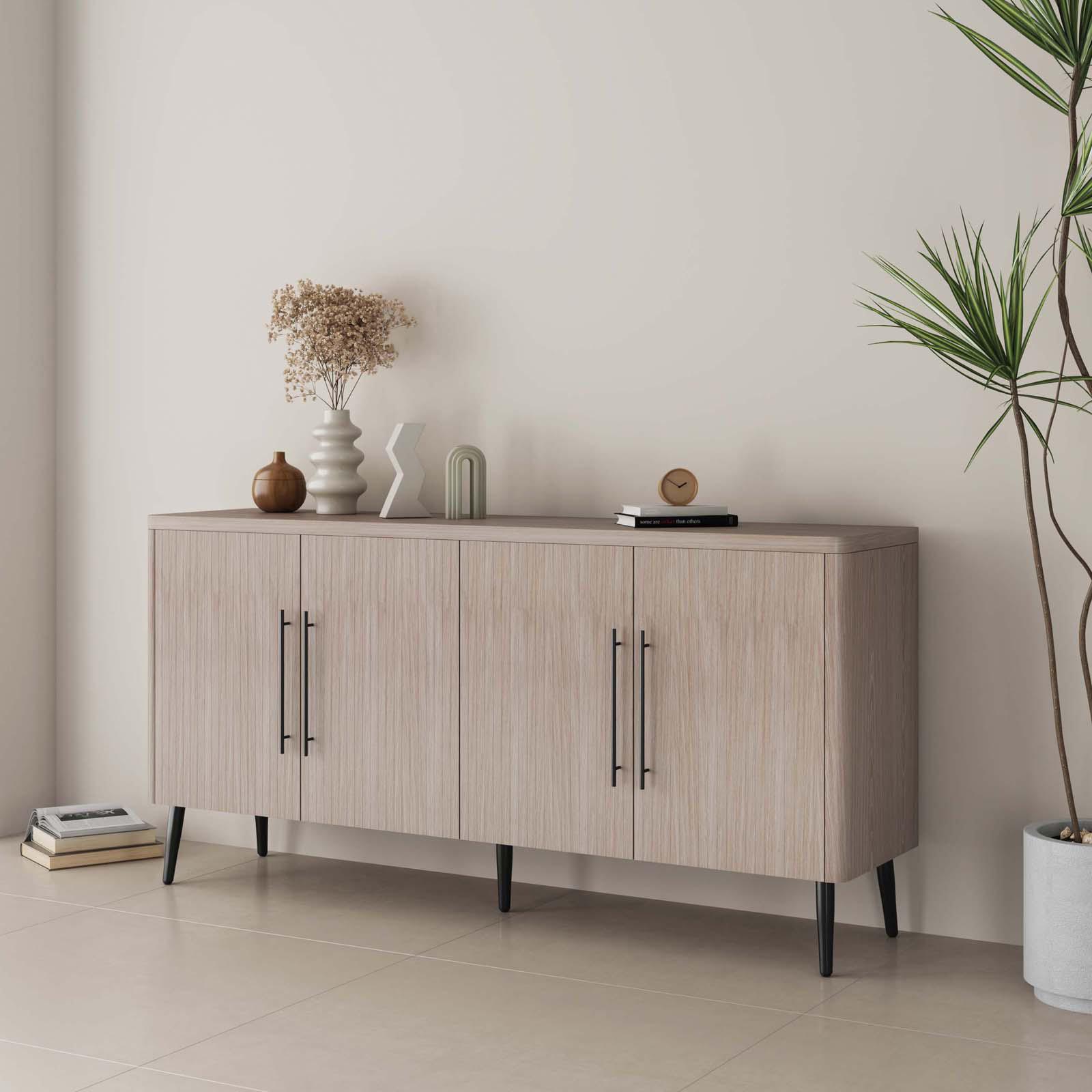 Introducing the Jodie Collection, a stunning new addition to the realm of Mid-Century modern design. Crafted from premium manufactured wood, each piece in this collection showcases exquisite wood ribbed drawers and doors, adding a textured sophistication to your living space. The sleek metal handles complement the splayed metal legs, creating a harmonious blend of elegance and contemporary flair. The Jodie Collection redefines style and function, offering timeless pieces that seamlessly enhance your home’s decor with a touch of modern nostalgia.