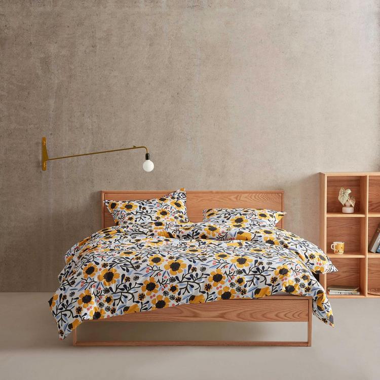 The Marimekko Mykero floral comforter set features a bold and vibrant floral design that captures the iconic Scandinavian style Marimekko is known for. The Mykero pattern typically includes large, Abstract Floral motifs with bright, cheerful colors, and in this case, the yellow tones are accented with other vivid hues to create a lively and eye-catching look. Designed using 100% cotton- a cotton percale weave fabric that is smooth and breathable. This comforter set has a cozy medium weight, smooth and crisp feel. Comforter fill- 100% polyester: 7.75oz fill weight. Full/queen comforter set includes 1 comforter and 2 standard shams.