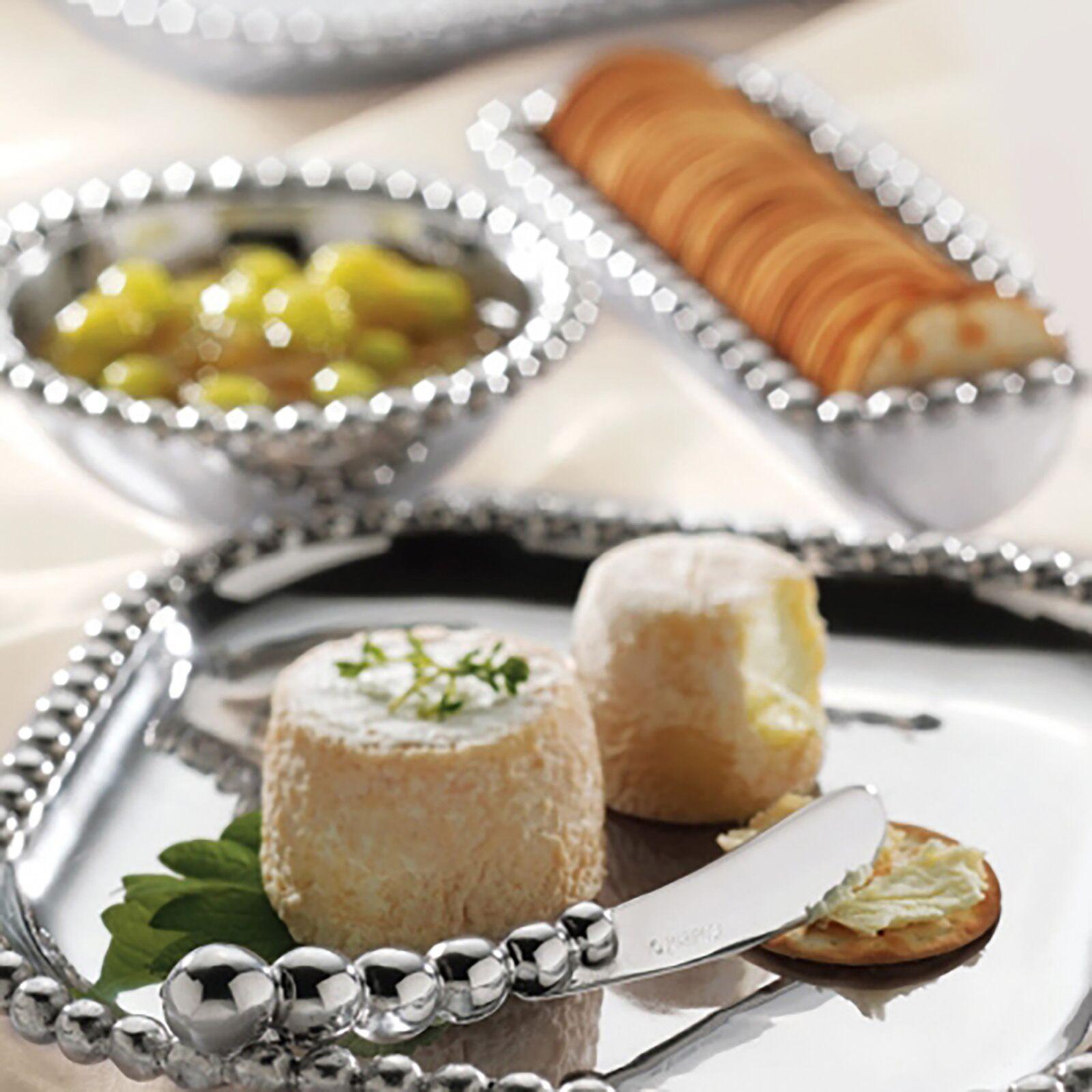 A multitude of pearls provide a luxurious border around the polished, silver interior of the Pearled Rectangular Platter.
