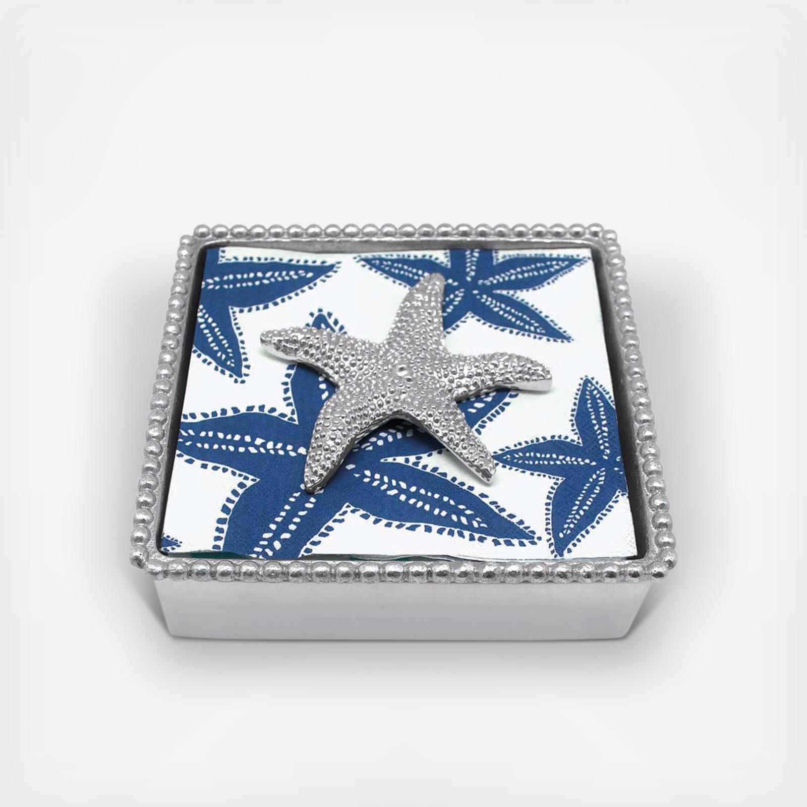 Bring undersea treasures to your table with our Seaside collection. The Starfish Beaded Napkin Box includes a stack of signature Mariposa stripe starfish napkins in teal, green and white.