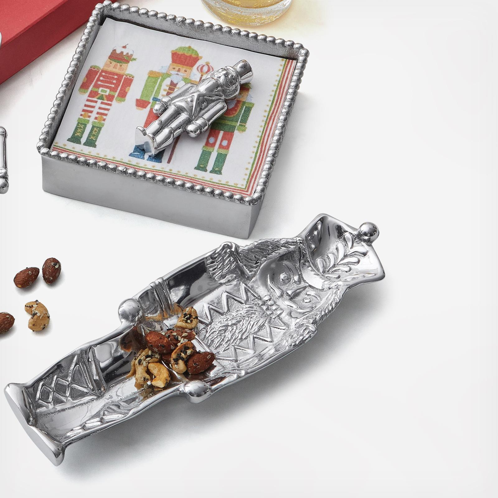 A festive Nutcracker Nut Dish is perfect for serving your favorite nuts or candies and adds a little winter magic to your next cocktail or holiday party. Pair with the holiday season bar accessories and decorative tree figurines to celebrate the season of giving, sharing and family. Handcrafted from 100% recycled aluminum. Beautifully boxed in a Red Mariposa Gift Box - we make gifting easy!